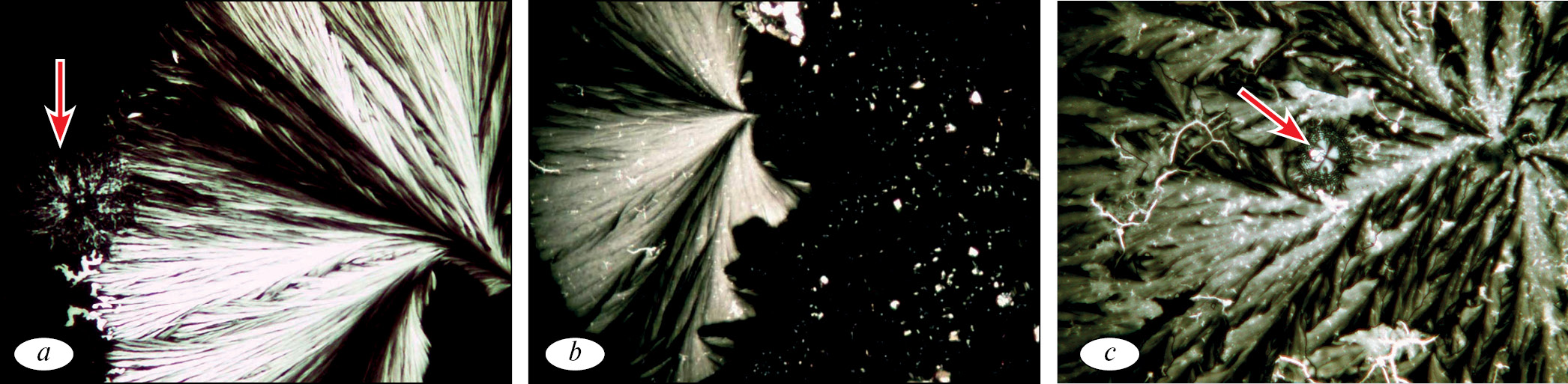 Рис. 2. Анизоморфоны сыворотки крови пациентки К. в пробах: а (проба 1) — слияние изотропного зернистого микросферолита с макросферолитом (стрелка); b (проба 2) — россыпи мелких гранул (несформированные микросферолиты), часть из которых связана с макросферолитом без повреждения его структуры; c (проба 3) — аномальная импрегнация микросферолитов и их фрагментов в макросферолит (стрелка), выраженная деструкция макросферолита. Микроскопия в поляризованном свете. Увел. ×200