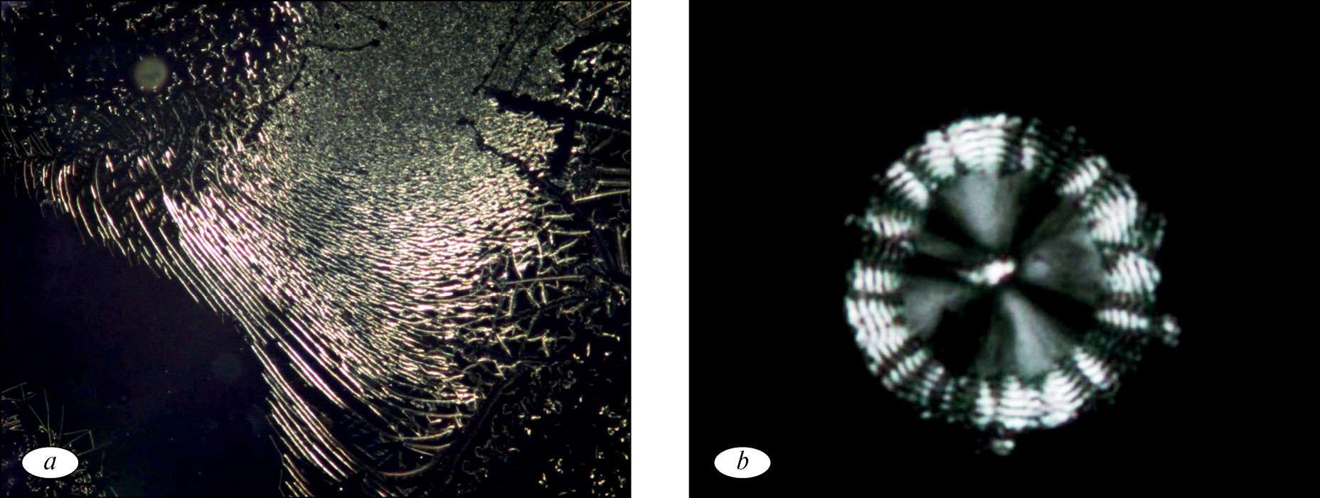 Рис. 3. Анизоморфоны сыворотки крови: а (проба 2) — каскад параллельных анизотропных линий (маркер пролиферации), увел. ×100; b (проба 3) — волнистый микросферолит (маркер агрессии на ксеногенный фактор), увел. ×800. Микроскопия в поляризованном свете