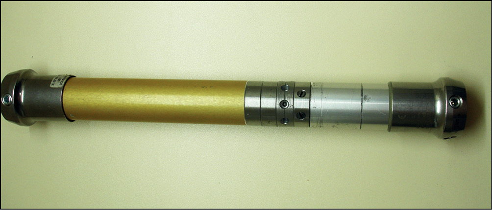 На наш взгляд, задача периодического изменения длины протеза может быть решена за счет простой в изготовлении и применении коррекционной вставки в стандартный несущий модуль, позволяющей точно и надежно изменять длину протеза вне зависимости от роста и веса пациента с культей нижней конечности на практически любом уровне (за исключением избыточно длинных). Конструкция позволяет дозированно, с шагом по 1 мм, изменять длину несущего модуля, а после коррекции длины жестко закрепить составные части устройства и обеспечить нагрузки большой выраженности. Более точная коррекция длины протеза также возможна, но для достижения клинической задачи этого не требуется. Оригинальная трехсоставная конструкция устройства в совокупности с применением технологического отверстия на косметической оболочке протеза позволяет производить многократную коррекцию длины протеза с высокой степенью быстроты и технической легкости, не прибегая к ремонту со сниманием косметической оболочки и заменой деталей модульной системы протеза (рис. 1–3).