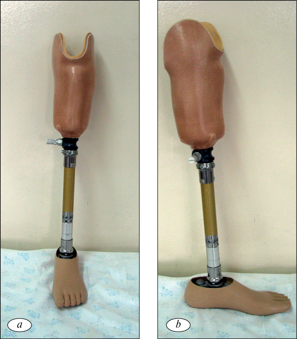 Рис. 4. Вид протеза голени без косметической отделки в прямой (а) и боковой проекции (b), в несущий модуль которого установлено устройство для коррекции длины протеза