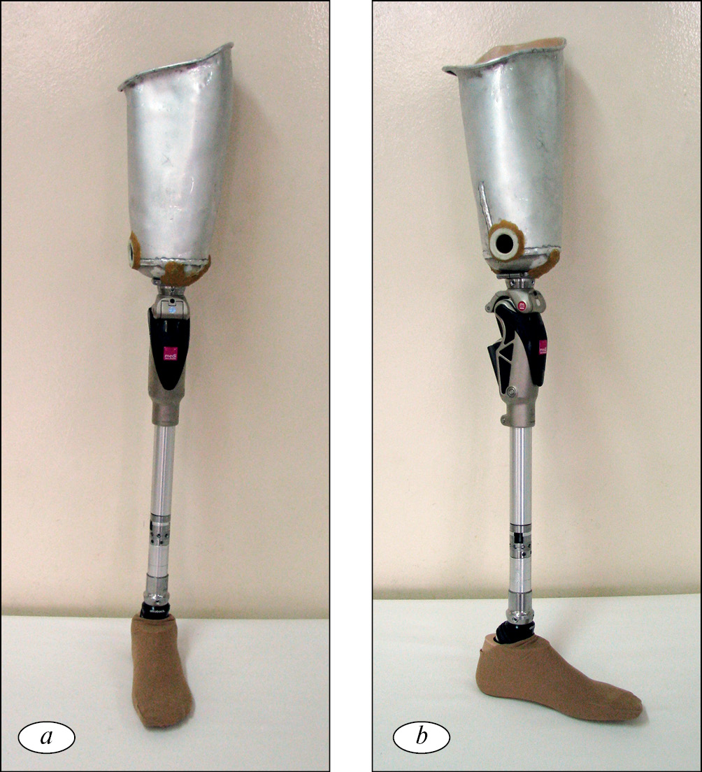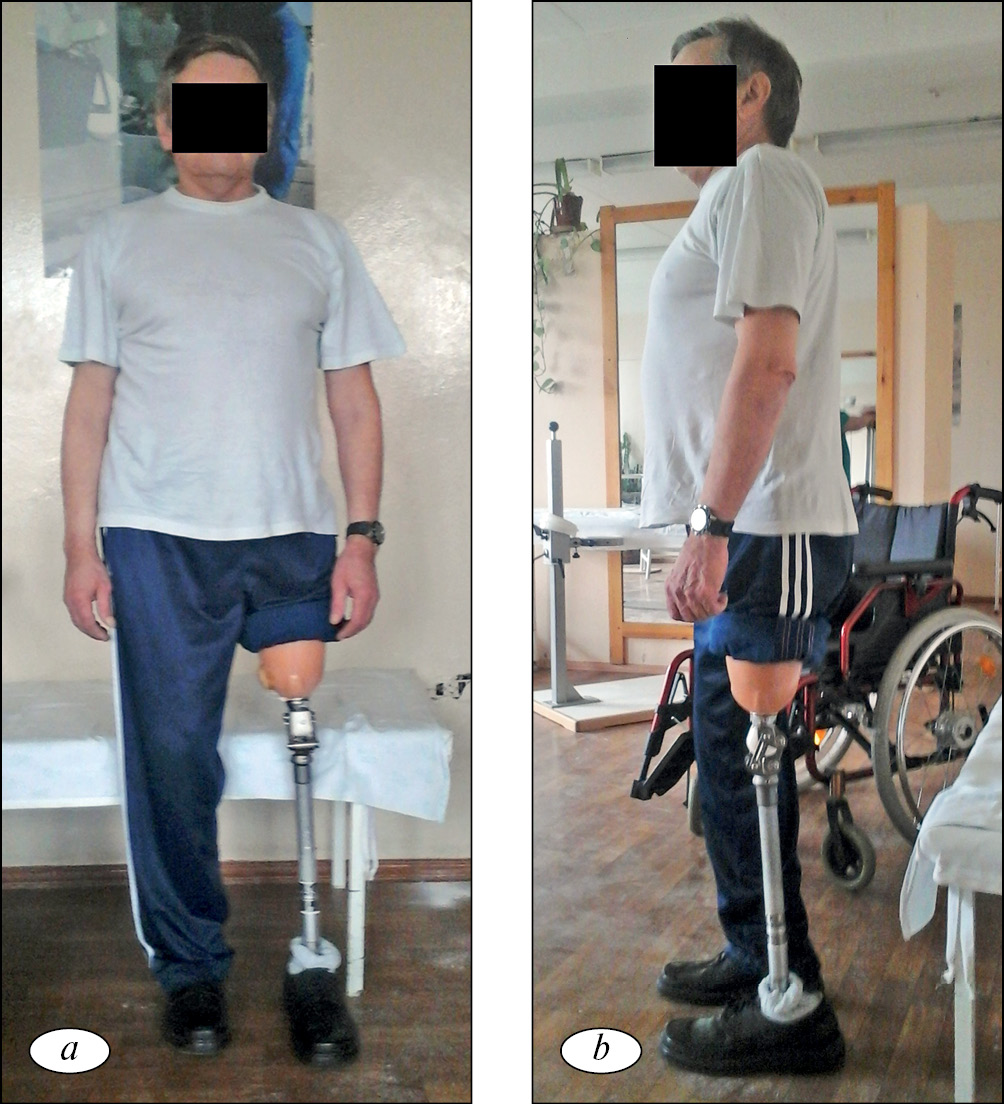 Рис. 6. Внешний вид пациента с ампутационной культей бедра в прямой (a) и боковой (b) проекции на протезе с возможностью дозированного увеличения и уменьшения его длины