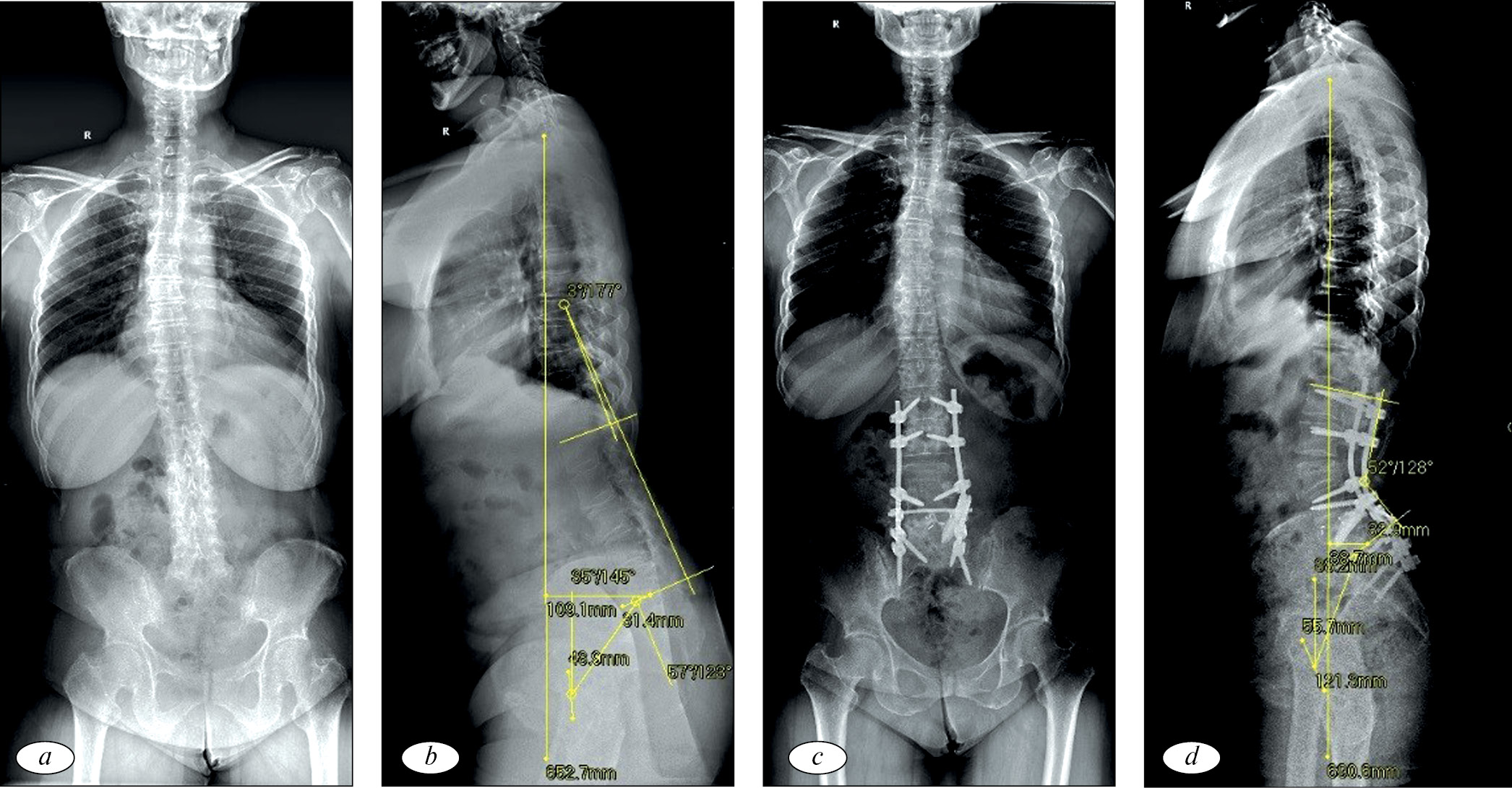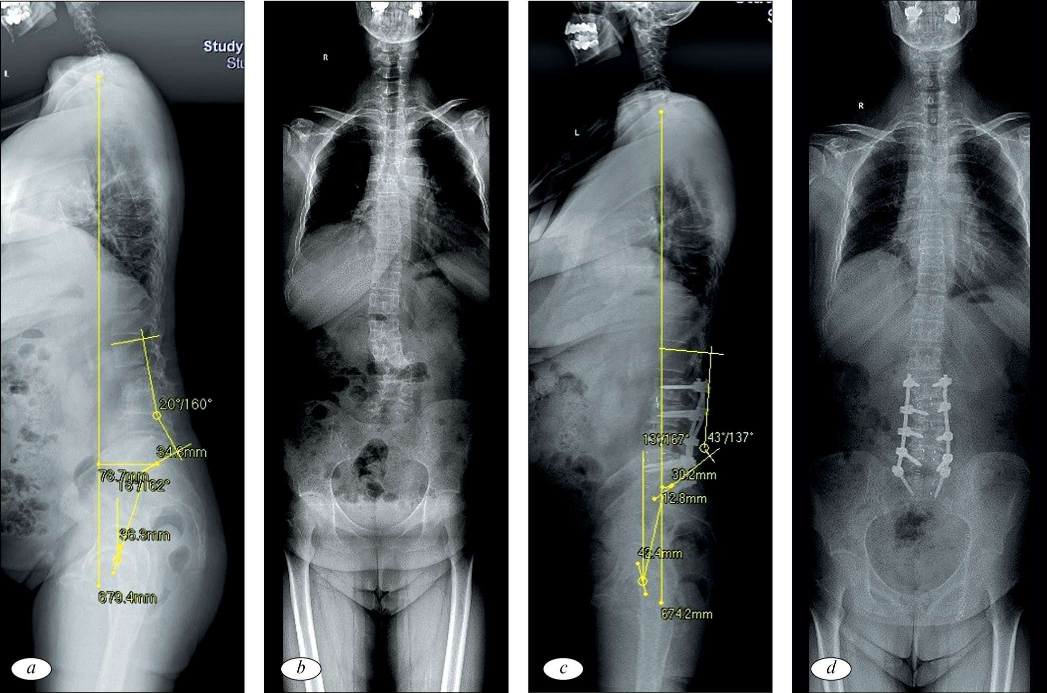 Рис. 2. Рентгенограммы пациентки, 50 лет, с поясничным сколиозом de novo, нарушением сагиттального баланса, дегенеративным стенозом, проявляющихся выраженным болевым синдромом в поясничном отделе позвоночника и нейрогенной перемежающейся хромотой: a и b — дооперационные рентгенограммы в степ-режиме в боковой и прямой проекциях. PI — 46°, PI-LL — 26°, PT — 18°, SVA — 78 мм, LDI — 96 %, GAP — 7 баллов, III тип Russouly. Пациентке проведено: ALIF на уровнях L4-L5, L5-S1 и DLIF на уровнях L2-L3, L4-L5, остеотомия Schwab I и II тип на всех уровнях, задняя винтовая фиксация L2-S1; с и d (через 1 год) — рентгенограммы в степ-режиме в боковой и прямой проекциях после. PI — 46°, PI-LL — 3°, PT — 13°, SVA — 30 мм, LDI — 79 %, GAP — 2 балла