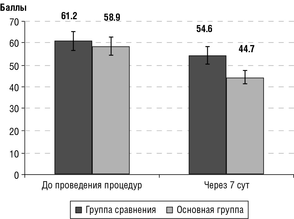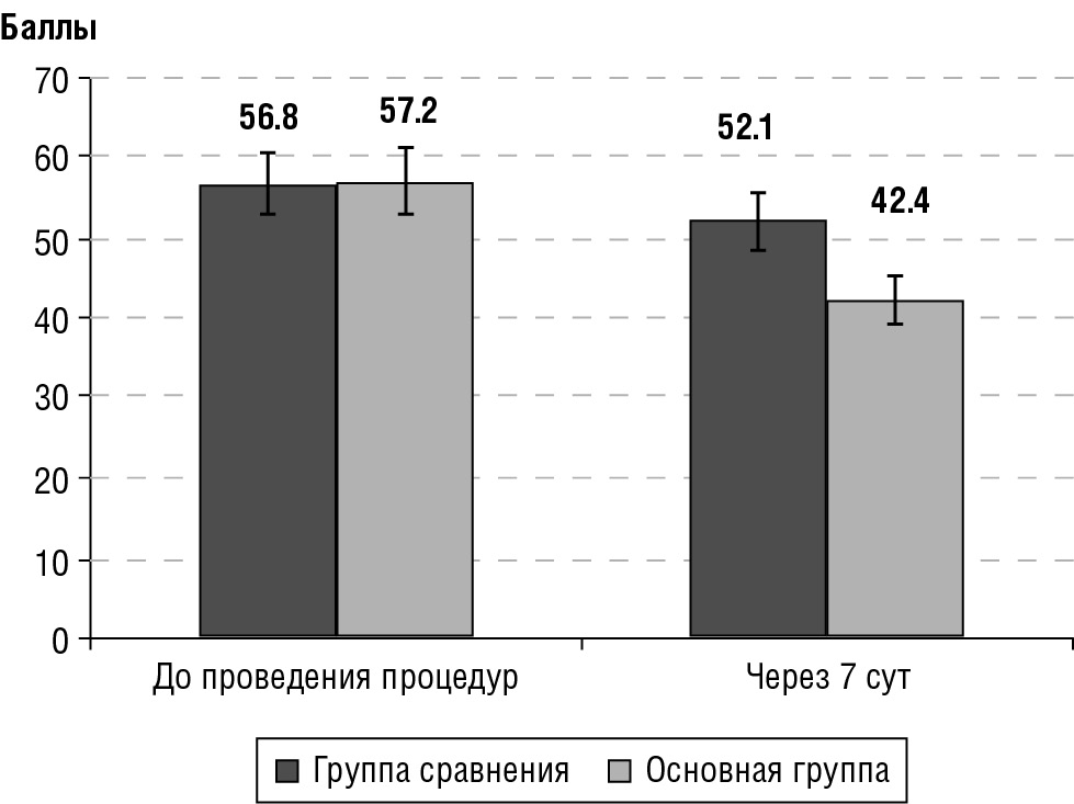 Уровни личностной тревожности также были повышены в обеих группах, значения данного показателя составили в группе сравнения и основной группе соответственно 61,2 ± 6,0 и 58,9 ± 4,1 балла (рис. 2). После курса процедур ББ у больных основной группы наблюдалось существенное снижение этого показателя до 44,7 ± 3,8 балла, что было достоверно меньше (p = 0,003), чем в группе сравнения — 54,6 ± 5,4 балла.