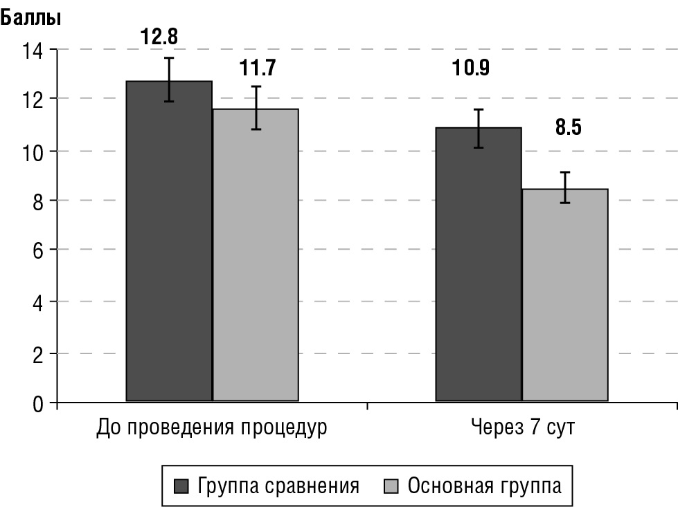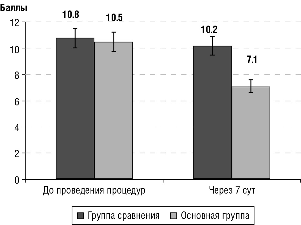Исходные значения показателя подшкалы депрессии HADS свидетельствовали о наличии депрессии у большинства больных обеих групп, которым планируется выполнение эндопротезирования тазобедренного сустава. После курса процедур ББ у пациентов основной группы отмечалось выраженное уменьшение данного показателя до 7,1 ± 0,8 балла, это значение было статистически значимо ниже (p = 0,011), чем в группе сравнения — 10,2 ± 1,2 балла (рис. 4). Нежелательных явлений во время и после проведения процедур ББ у пациентов отмечено не было.