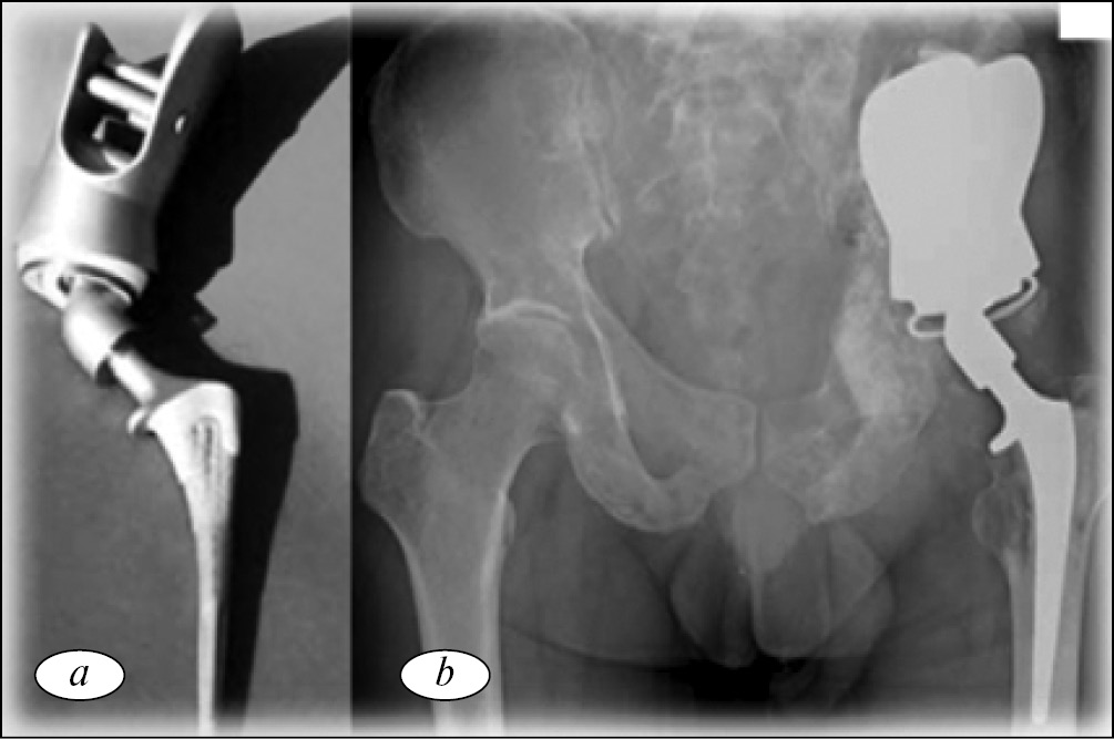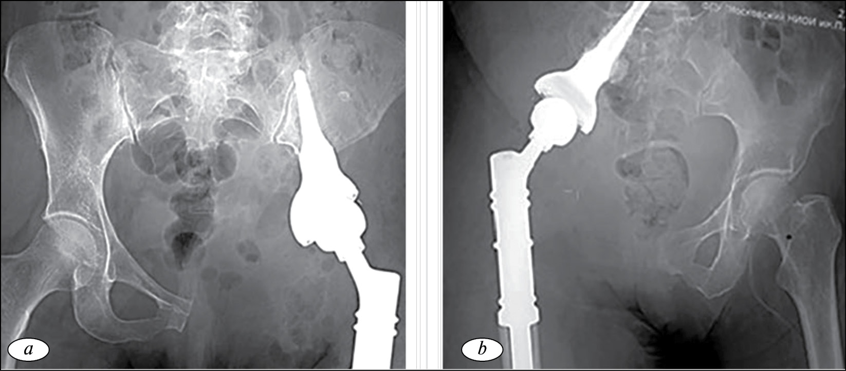Рис. 6. Рентгенограмма костей таза после операции: a — коническая ножка имплантирована в оставшуюся после удаления опухоли часть подвздошной кости; b — коническая ножка имплантирована в крестец после удаления половины таза, пораженной опухолью