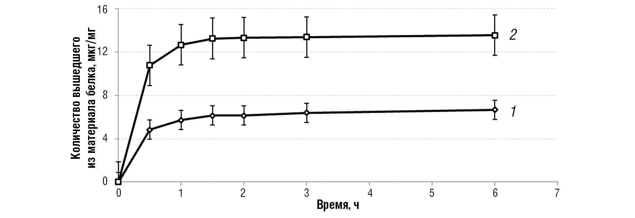 Рис. 1. Динамика выхода общего белка лизата тромбоцитов из октакальциевого фосфата при инкорпорации в 10 % (кривая 1) и 20 % (кривая 2) растворе лизата тромбоцитов