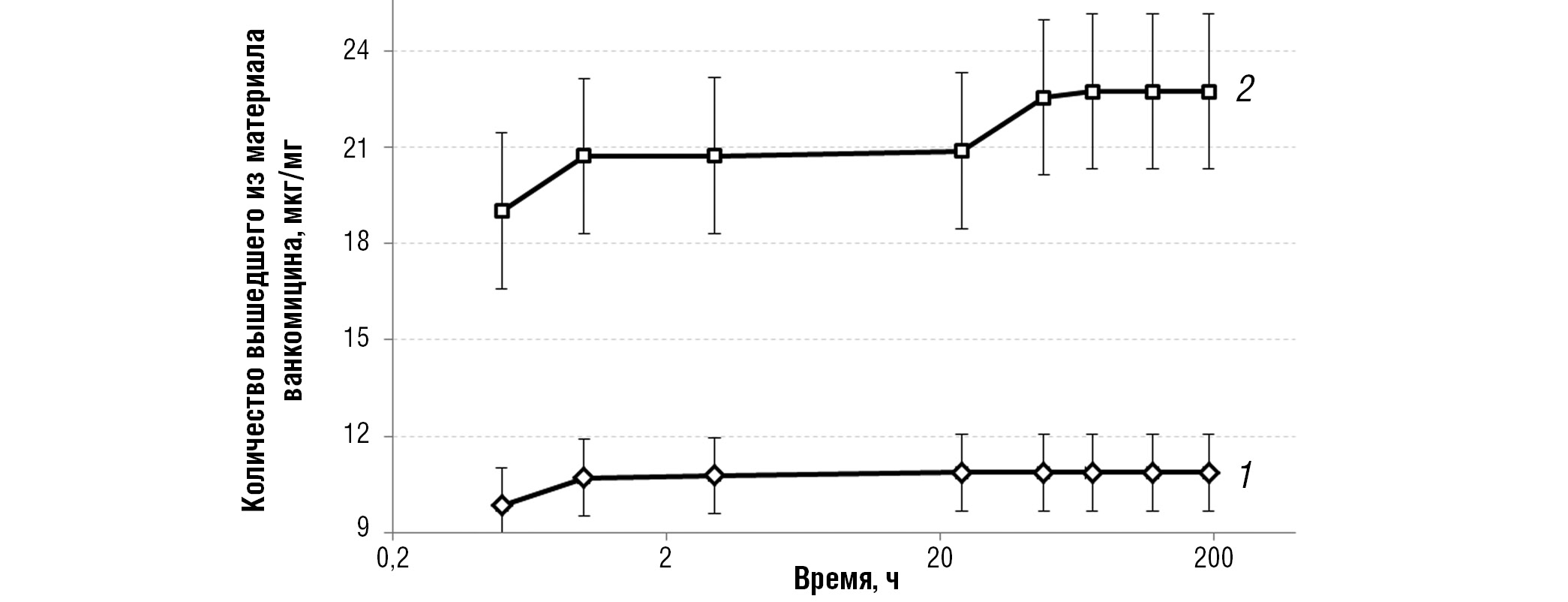 Через 24 ч кривые вышли на плато. К восьмым суткам исследования опытные образцы полностью растворились, но дополнительного выхода ванкомицина в раствор зарегистрировано не было.