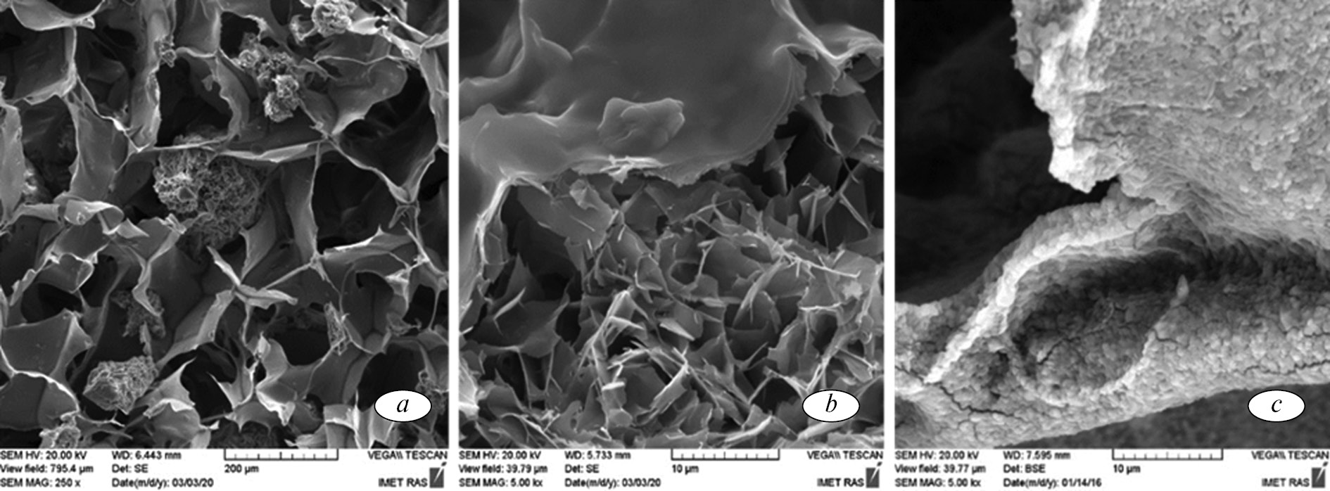 Функционализацию этого материала производили в два этапа. На первом произвели модификацию поверхности композита путем биомиметического осаждения КФ-слоя. Исходный материал имел ячеистую полимерную структуру с гладкой поверхностью, в порах которой располагались гранулы ОКФ в виде кристаллов игольчатой и пластинчатой формы (рис. 3, a, b). После модификации поверхность полимера была покрыта неравномерно распределенным кристаллическим слоем из мелких округлых кристаллов размером до 0,5–1,0 мкм (рис. 3, c). В результате модификации удельная площадь поверхности матрикса увеличилась с 8,6 до 13,0 м2/г.