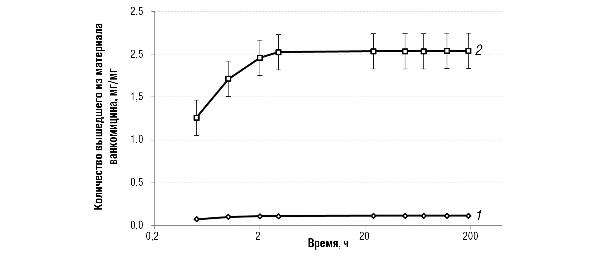 Рис. 4. Динамика выхода ванкомицина из композиционного матрикса при инкорпорации в растворах с исходной концентрацией 5,0 мг/мл (кривая 1) и 50,0 мг/мл (кривая 2)