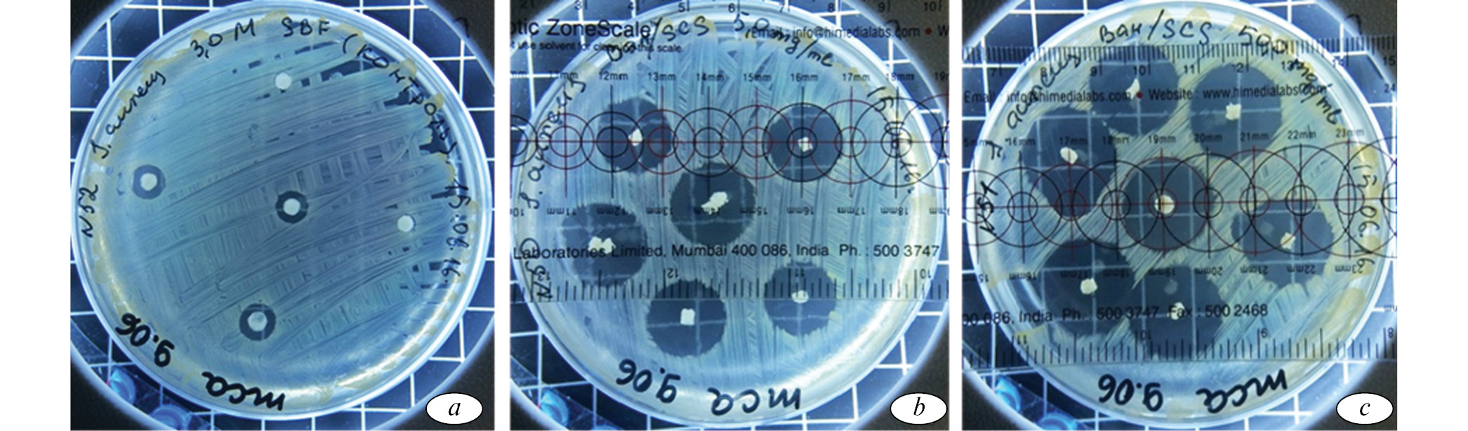 Рис. 5. Зоны подавления бактериального роста: a — контрольными образцами (нефункционализированные матриксы), 0–5 мм; b — функционализированными образцами, содержащими 0,1 мг/мг ванкомицина, 16,0 мм; c — функционализированными образцами, содержащими 2,0 мг/мл ванкомицина, 20,0 мм
