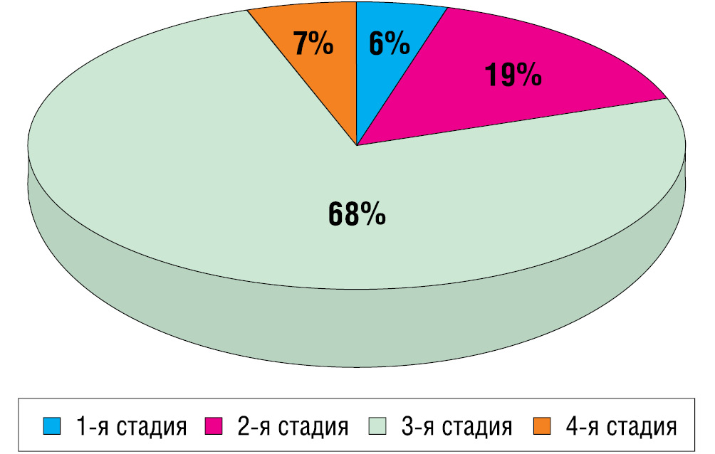 В соответствии с данной классификацией, у 1 пациента была 1-я стадия HR, у 3 — 2-я, у 11 — 3-я стадия и у 6 пациентов — 4 стадия заболевания (рис. 1).