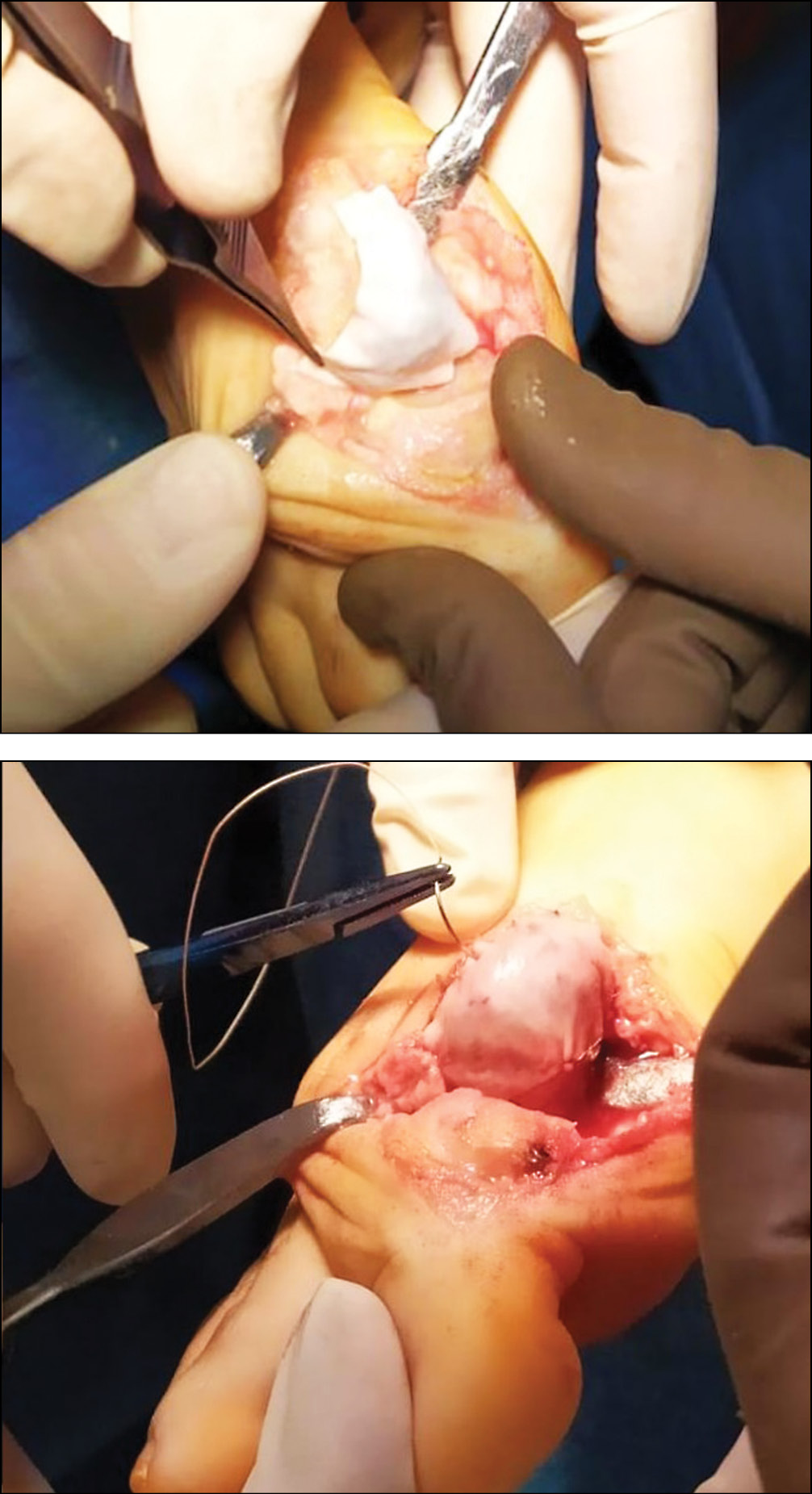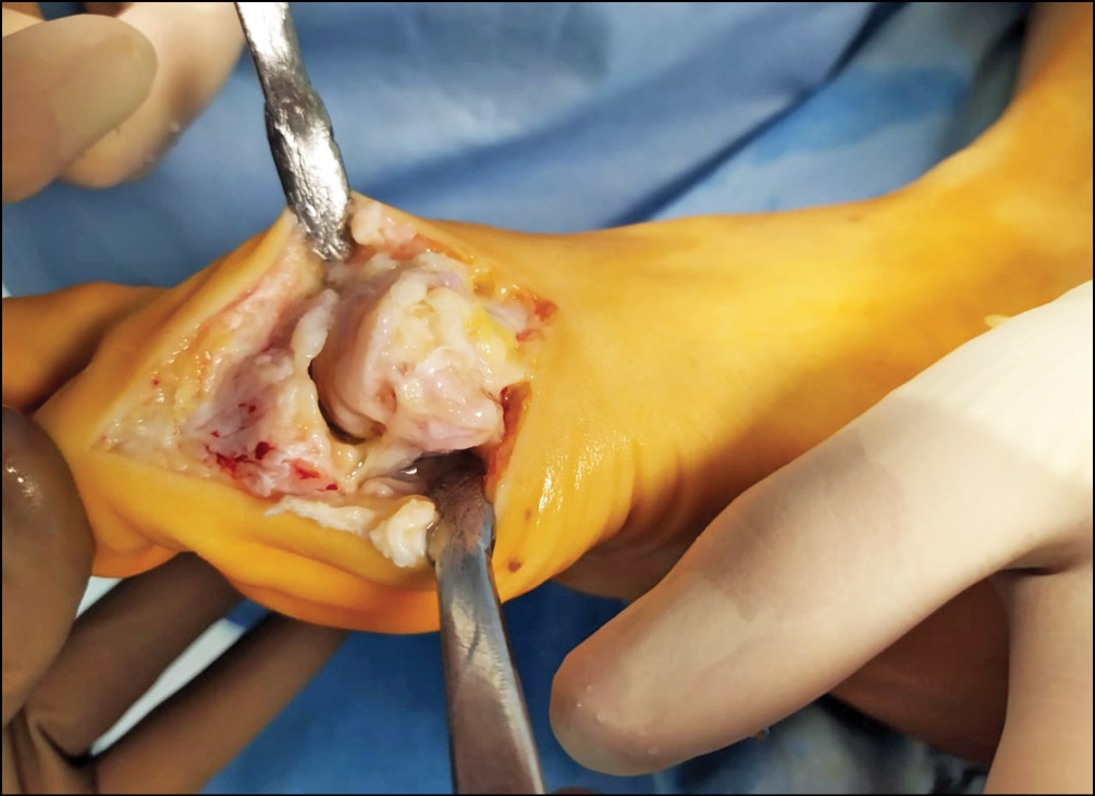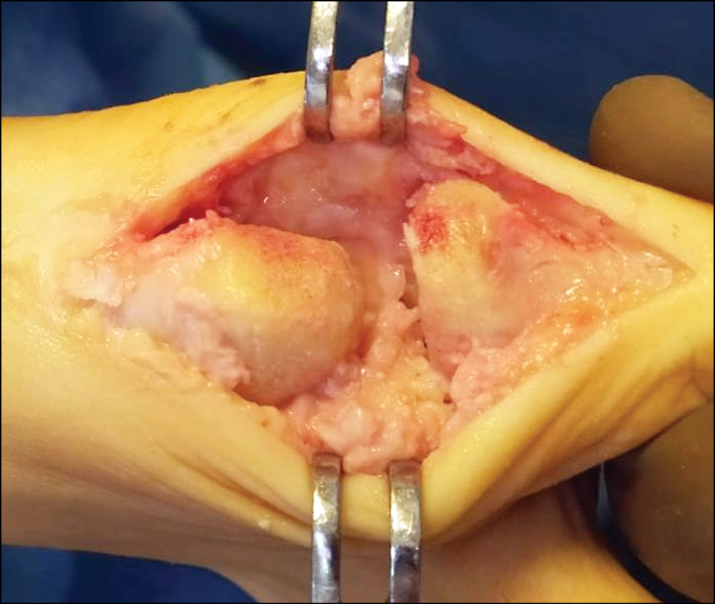 Нами разработана следующая техника операции: выполняли прямой медиальный кожный разрез в проекции I ПФС длиной 4 см с последующей мобилизацией кожи с подкожно-жировой клетчаткой, обнажением капсулы сустава и артротомией (рис. 2).
