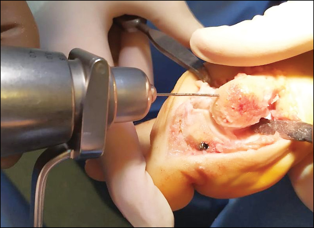 Далее выполняли хейлэктомию: осуществляли удаление остеофитов с головки I ПК и основания ПФПП; затем обрабатывали зону дефекта хряща на головке ПК до субхондральной кости (рис. 3), с помощью шила или тонкой спицы выполняли микрофрактурирование данного участка, при этом расстояние между микроперфорациями — 2–3 мм (рис. 4), и укрывали дефект предварительно подготовленной коллагеновой матрицей, которую фиксировали по краям к неповрежденному хрящу и/или надкостнице с помощью тонких рассасывающихся нитей — PDS, Vicryl или Monosyn 6-0 (рис. 5). При этом матрицу накладывали на дефект пористым слоем к поверхности кости.