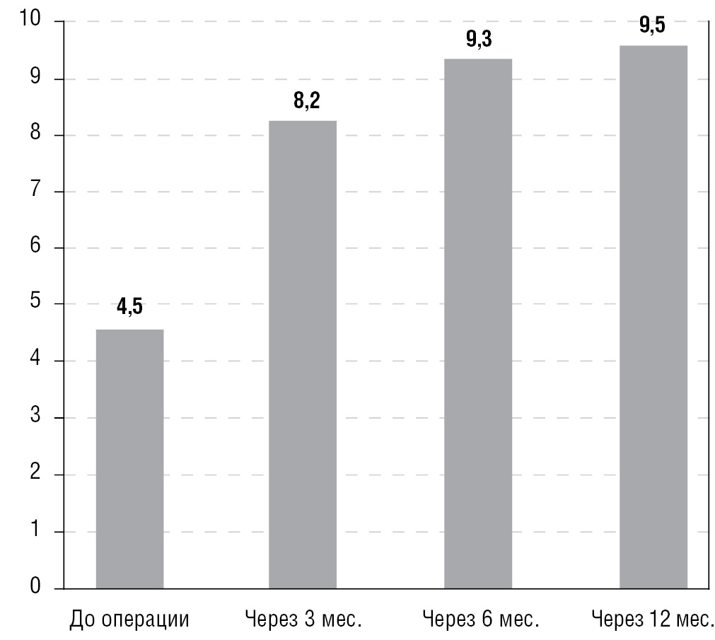Через 3 мес. после выполненной хондропластики медиана VAS FA увеличилась с 4,5 до 8,2 (минимальный показатель — 6,1, максимальный — 9,2; p < 0,024, W = –36,0). Через 6 мес. продолжило наблюдаться увеличение медианы VAS FA до 9,3 (минимальный показатель — 6,6, максимальный — 9,9; p < 0,024, W = –36,0), а через 12 мес. показатель медианы VAS FA составил 9,5 (минимальный показатель – 7,9, максимальный – 10; p < 0,024, W = 36,0).