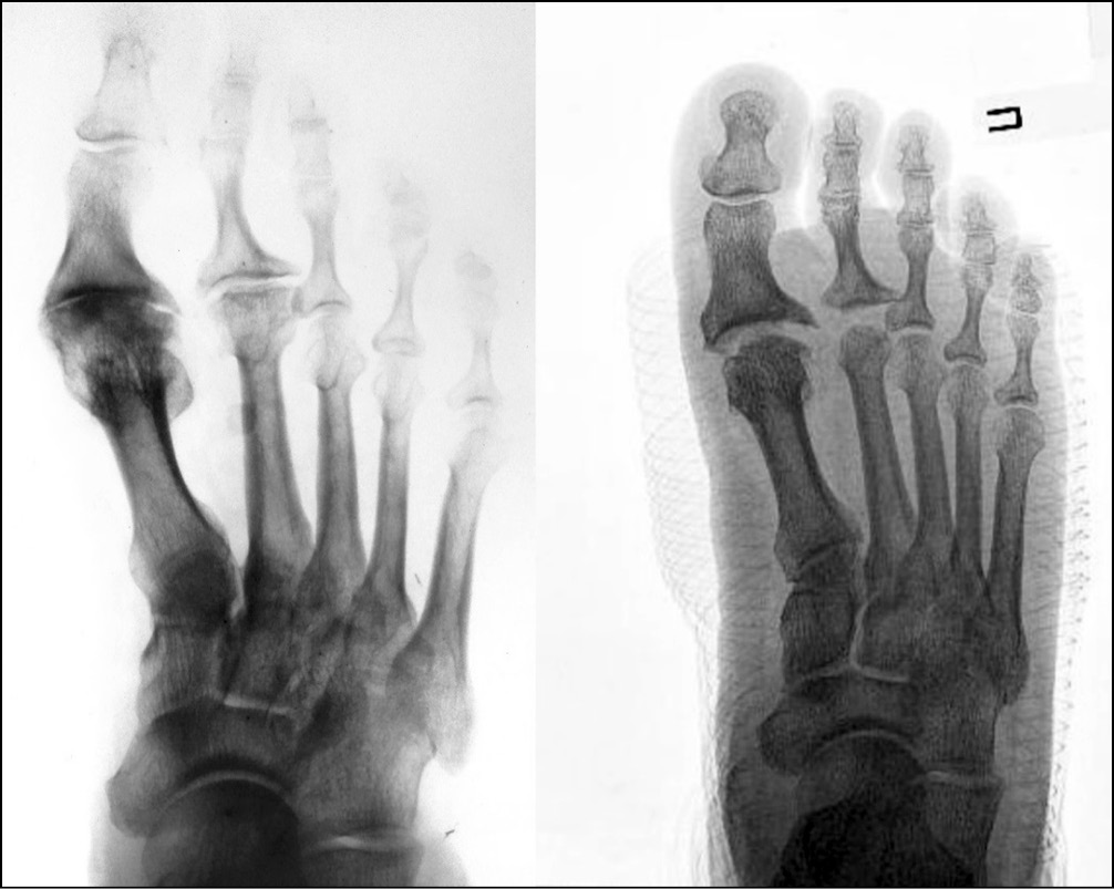 Рис. 11. Рентгенограмма стопы до и в первые сутки после хондропластики I и II плюснефаланговых суставов