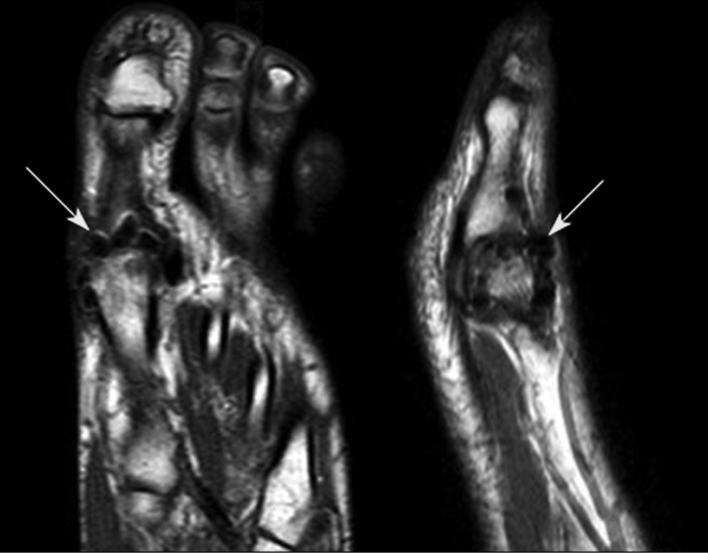 Особый интерес представляет собой картина магнитно-резонансной томографии стопы после операции. В области оперированной головки I ПК определяются гроздевидные образования — «артефакты», трактовка природы которых затруднена (рис. 13).