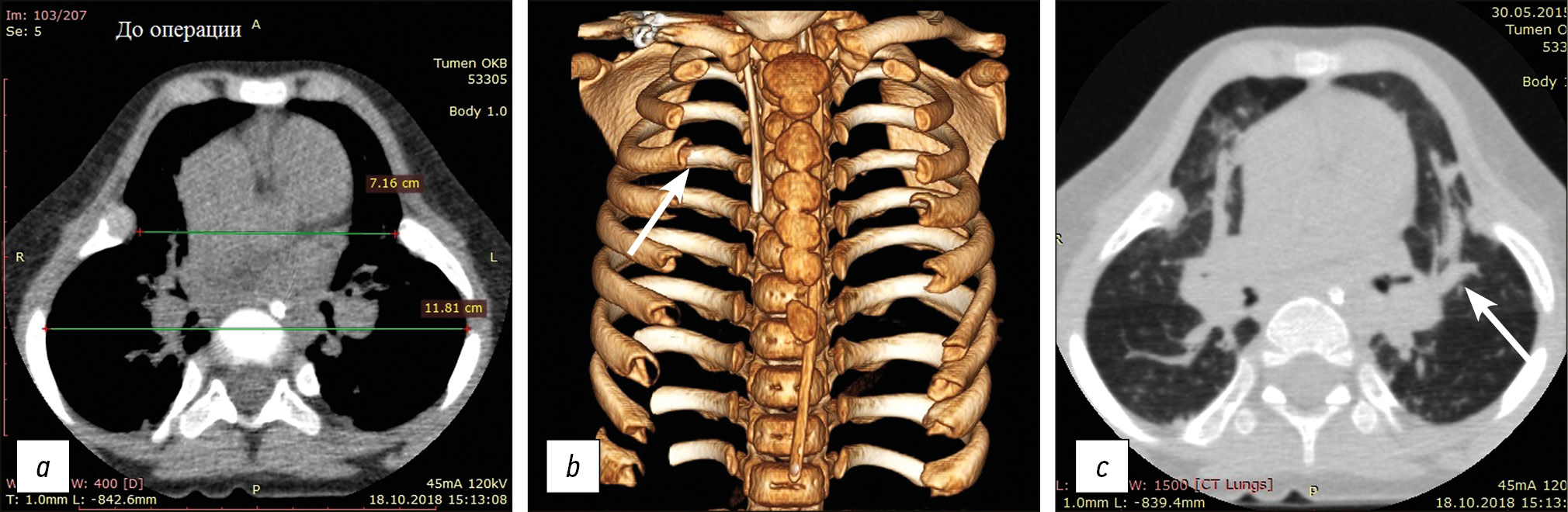Рис. 3. Компьютерная томограмма (а) и 3D-компьютерная реконструкция (b) после I этапа хирургического лечения: а — аксиальный срез (индекс горизонтальной компрессии грудной клетки = 71,8 %); b — правый гемиторакс имеет правильную форму (положение одной из реберных пластин отмечено стрелкой); с — 3D-мультиобъемная реконструкция