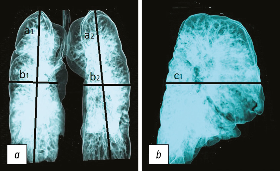 Рис. 2. Параметры расчета условного объема легких при трехмерной мультиобъемной реконструкции (3D-MVR) легких: а — в переднезадней проекции; b — в боковой проекции. a, b, c — показатели объема легких, индексы 1 и 2 обозначают правое и левое легкое соответственно