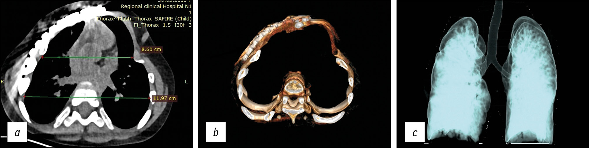 Проводившаяся терапия (антибактериальная, глюкокортикостероиды, инфузионная, гепатопротекторы, диуретики) позволила к 39-м суткам купировать пневмонию и бронхит. Однако неоднократные попытки перевести ребенка на самостоятельное дыхание оказались безуспешны, в связи с чем на этом этапе ребенок по согласованию с главным внештатным специалистом-экспертом по торакальной хирургии МЗ РФ профессором П.К. Яблонским консультирован специалистом по торакальной ортопедии. При пересмотре данных КТ констатировано, что согласно классификации врожденных пороков грудной клетки [7], данная аномалия может быть классифицирована как тип А2S0F1cor, br (симметричная деформация преимущественно в горизонтальной плоскости с функциональными нарушениями сердечно-сосудистой и дыхательной систем). Индекс горизонтальной компрессии грудной клетки (ИГКГК) (отношение поперечного размера на уровне максимальной компрессии к наибольшему поперечному размеру) [7] составляет 60,1 %.