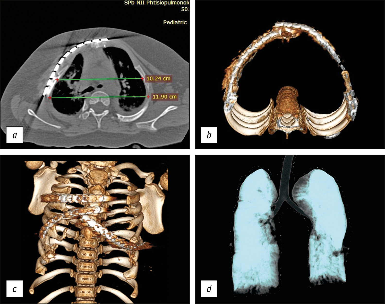 Рис. 4. Компьютерная томограмма (а) и 3D-компьютерная реконструкция (b, c) после II этапа реконструкции грудной клетки: а — аксиальный срез; b — положение одной из реберных пластин отмечено стрелкой; c — фронтальный вид; d — 3D-мультиобъемная реконструкция