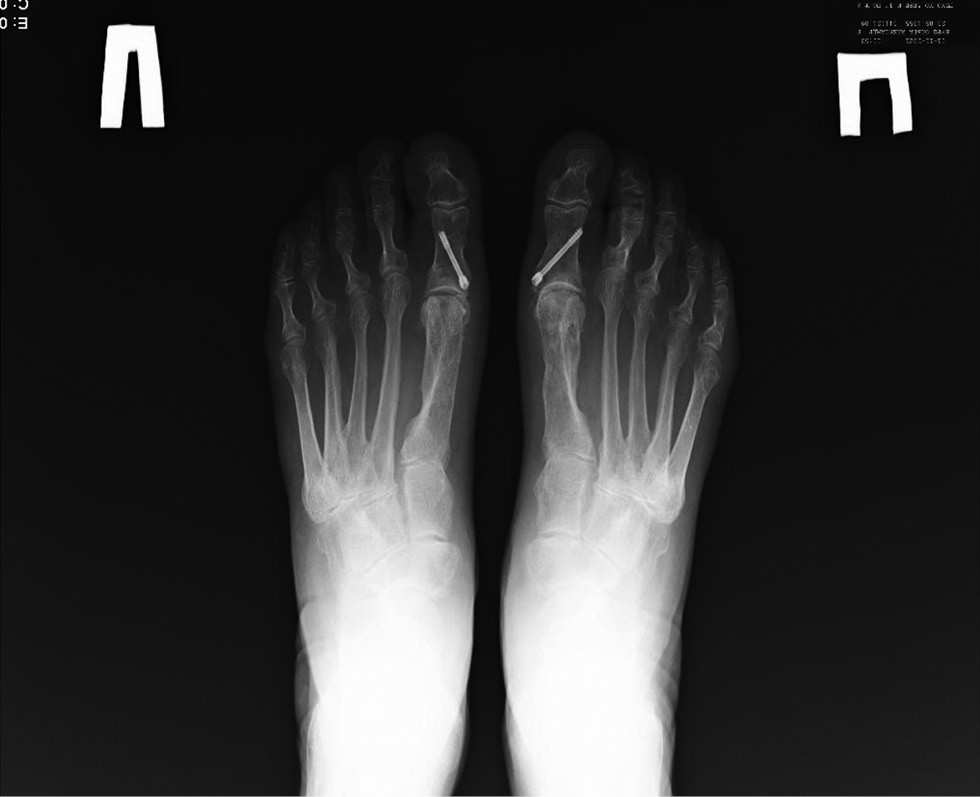 Fig. 2. Radiographs of feet 5 years after the surgical treatment. Screws removed from the 1st metatarsal bones of both feet.