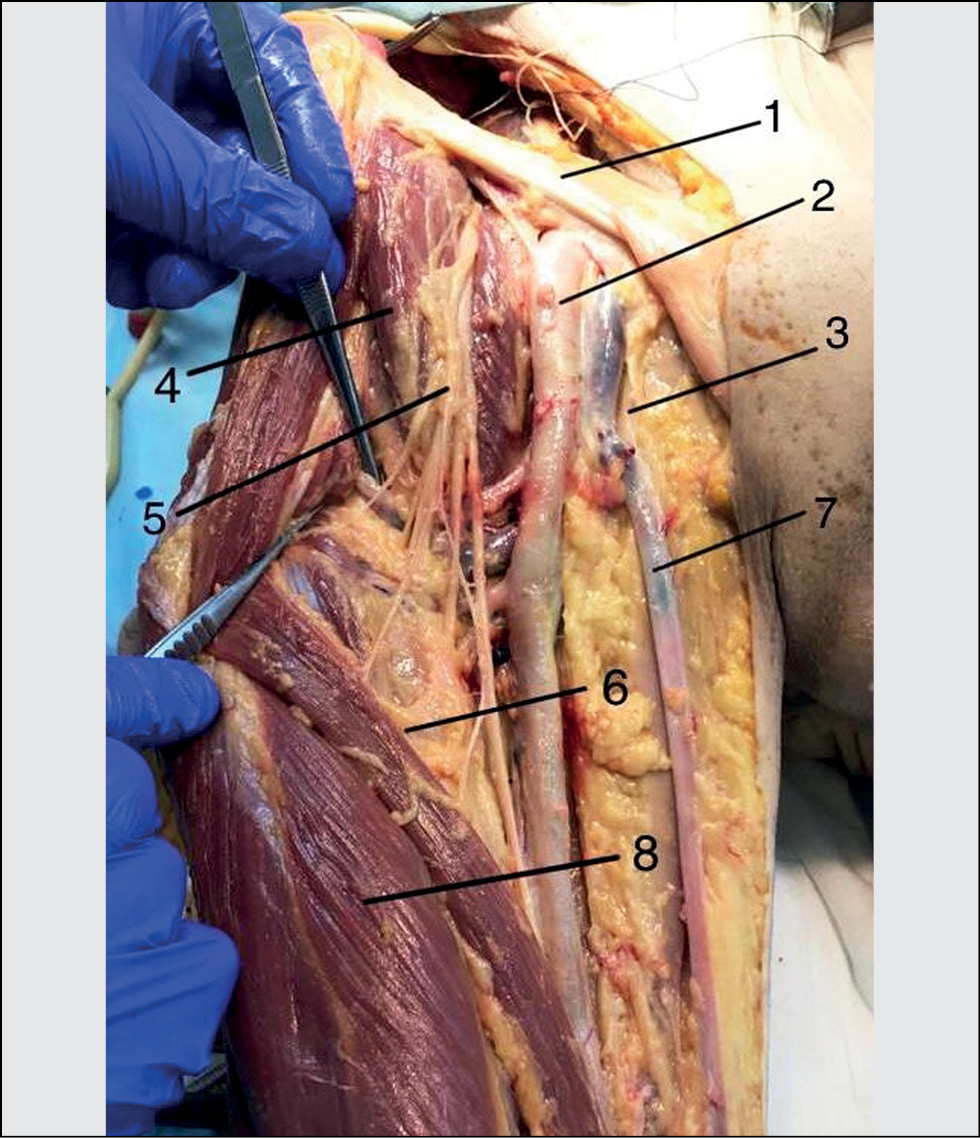 Рис. 1. Анатомия передней области бедра (здесь и в рис. 2–8: фото сделано при использовании кадаверного материала, предоставленного «Ekb_Cadaver_Lab» при АНО ДПО «Научно-образовательный медицинский центр», г. Екатеринбург): 1 — паховая связка (lig. inguinale), 2 — бедренная артерия (a. femoralis), 3 — бедренная вена (v. femoralis), 4 — подвздошно-поясничная мышца (m. iliopsoas), 5 — бедренный нерв (n. femoralis), 6 — портняжная мышца (m. sartorius), 7 — большая подкожная вена (v. saphena magna), 8 — прямая мышца бедра (m. rectus femoris).