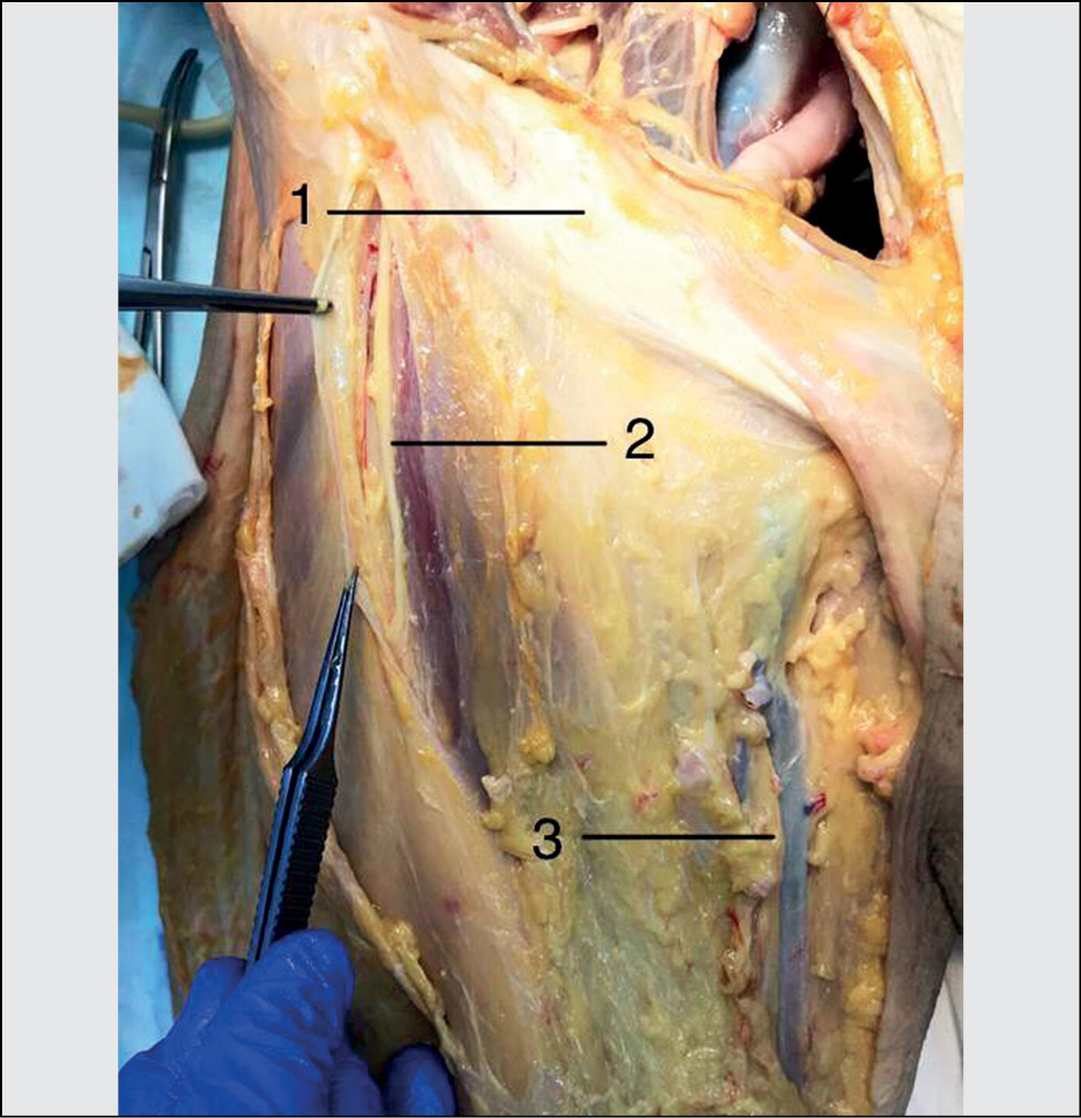 Рис. 2. Анатомия передней области бедра: 1 — паховая связка (lig. inguinale), 2 — латеральный кожный нерв бедра (lateral femoral cutaneous nerve), 3 — большая подкожная вена (v. saphena magna).