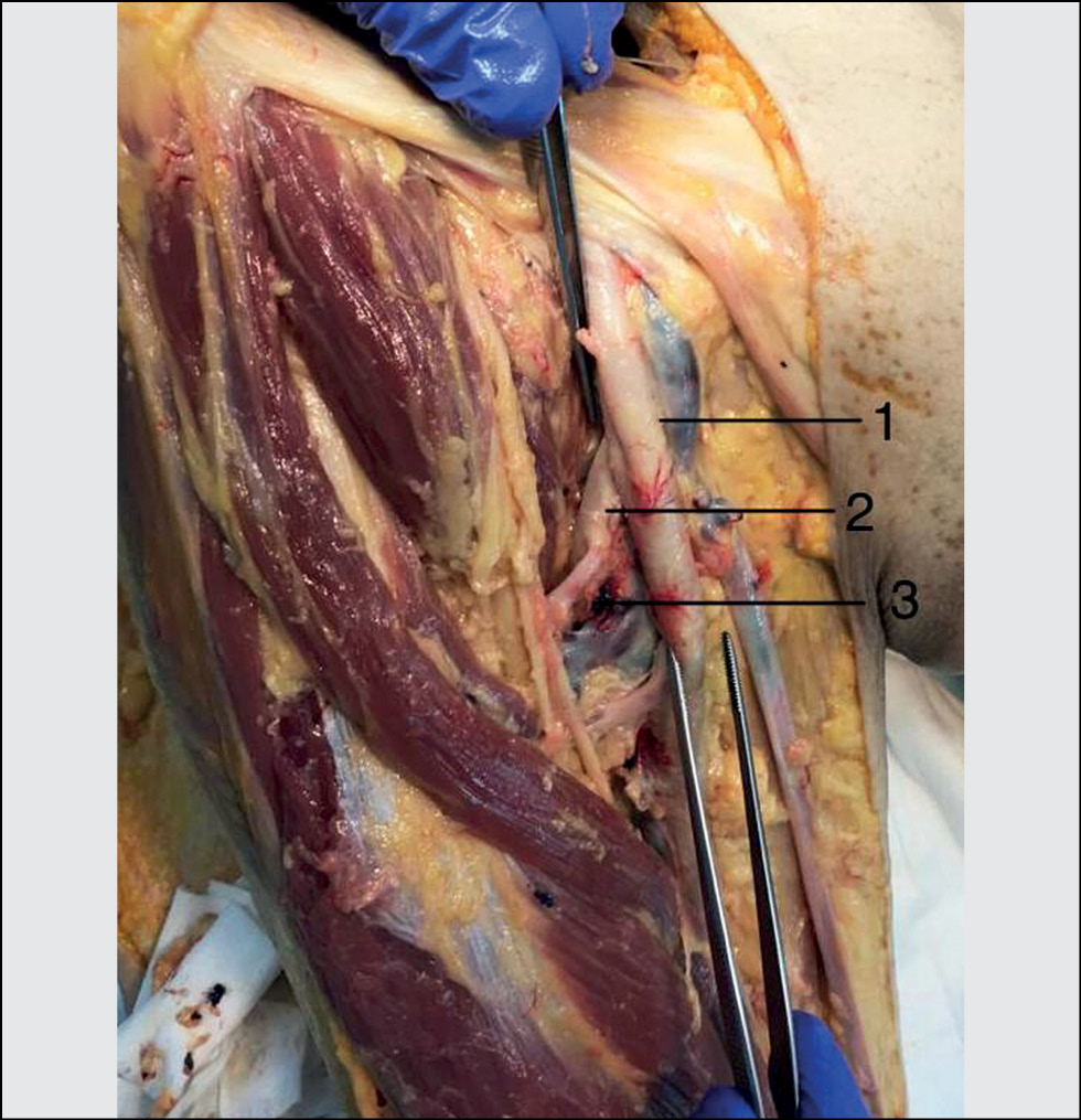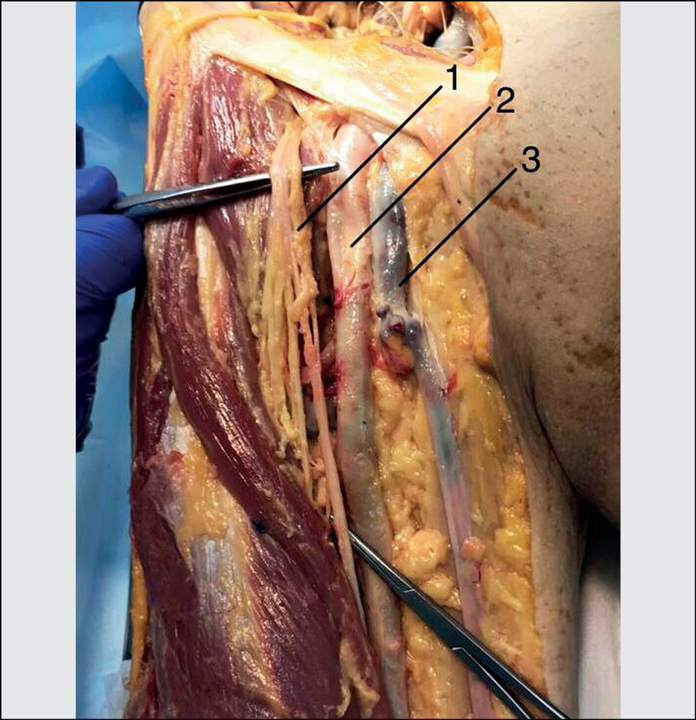 Fig. 3. The neurovascular bundle of the anterior region of the thigh: 1 — branching of the femoral nerve, 2 — femoral artery (a. femoralis), 3 — femoral vein (v. femoralis).