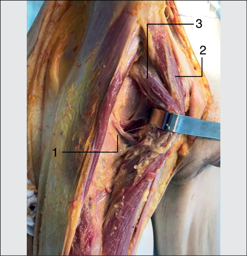 Рис. 5. Анатомия передней области бедра, глубокие слои: 1 — латеральная артерия, огибающая бедренную кость (a. circumflexa femoris lateralis), 2 — портняжная мышца (m. sartorius), 3 — прямая мышца бедра (m. rectus femoris).