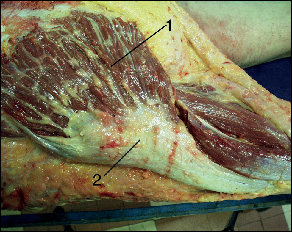 Fig. 6. Anatomy of the gluteal region: 1 — gluteus maximus (m. gluteus maximus), 2 — ilio-tibial tract (tractus ilio-tibialis).