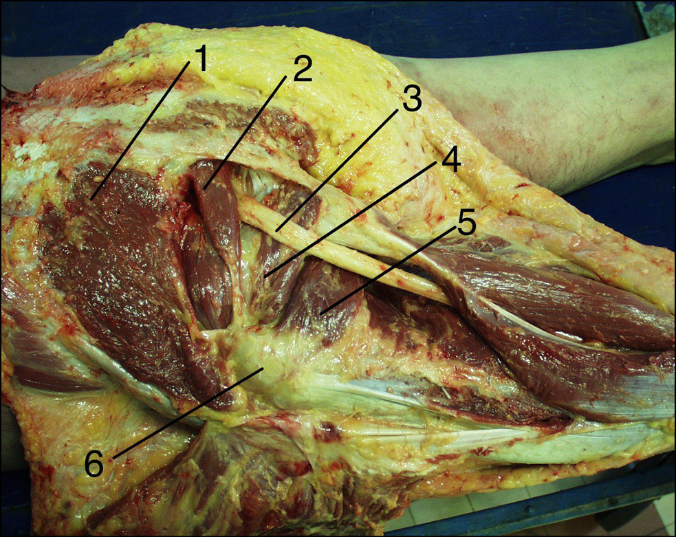 Рис. 7. Анатомия ягодичной области: 1 — средняя ягодичная мышца (m. gluteus medius), 2 — грушевидная мышца (m. piriformis), 3 — седалищный нерв (n. ischiadicus), 4 — мышечный пласт, состоящий из верхней близнецовой, внутренней запирательной и нижней близнецовой мышц (mm. gemmeli sup. et inf., m. obturatorius internus), 5 — квадратная мышца (m. quadratus), 6 — большой вертел (trochanter major).
