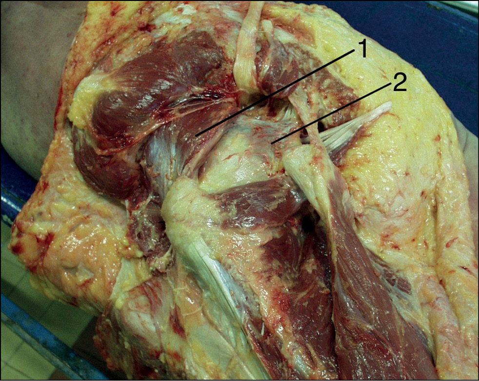 Fig. 8. Anatomy of the gluteal region: 1 — small gluteal muscle (m. gluteus minimus), 2 — capsule of the hip joint.