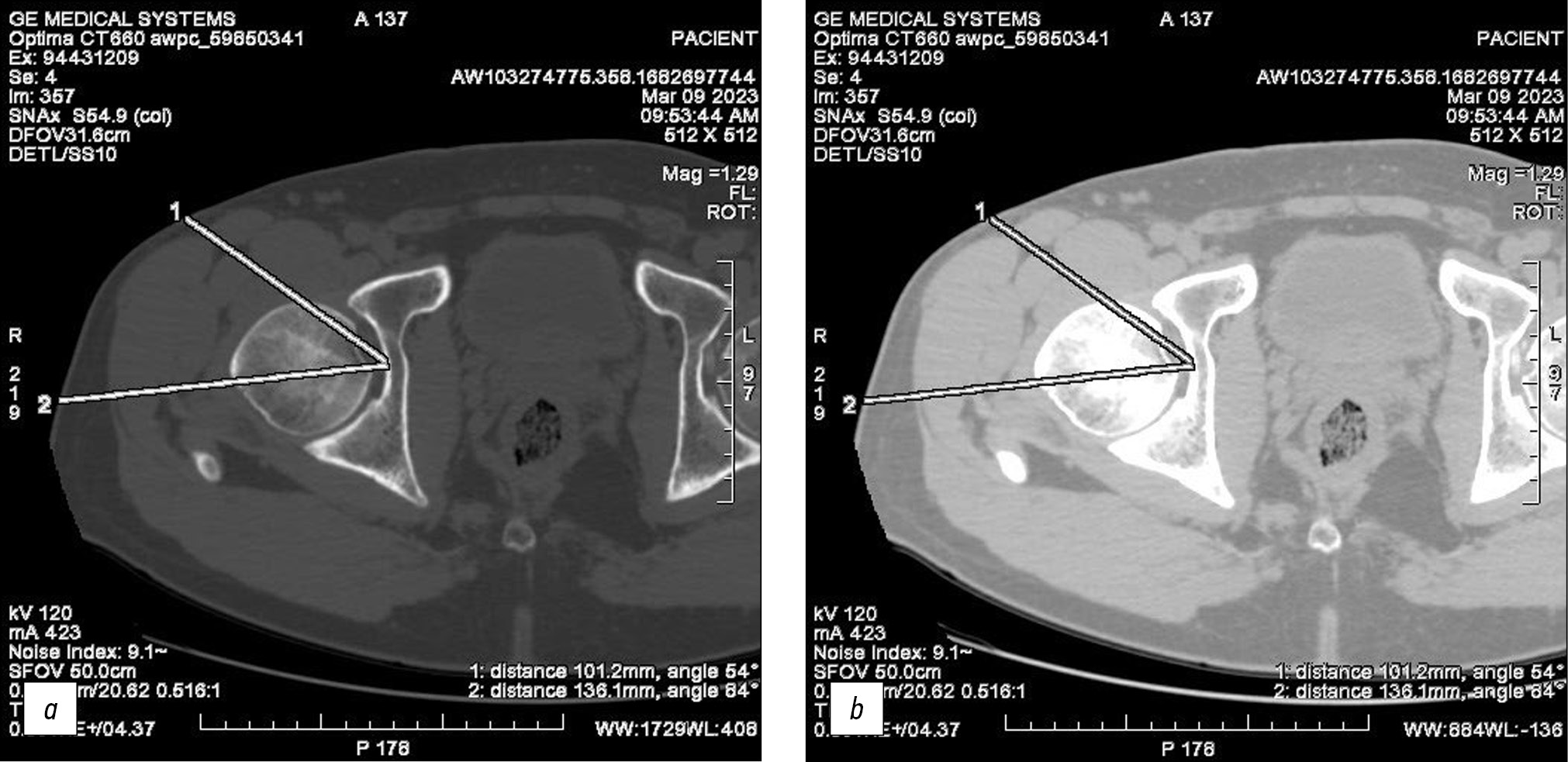 Рис. 9. Снимки мультиспиральной компьютерной томографии, аксиальные срезы: a — костный режим, b — мягкотканный режим, 1 — измерение глубины раны при переднем доступе, 2 — измерение глубины раны при доступе по Хардингу.