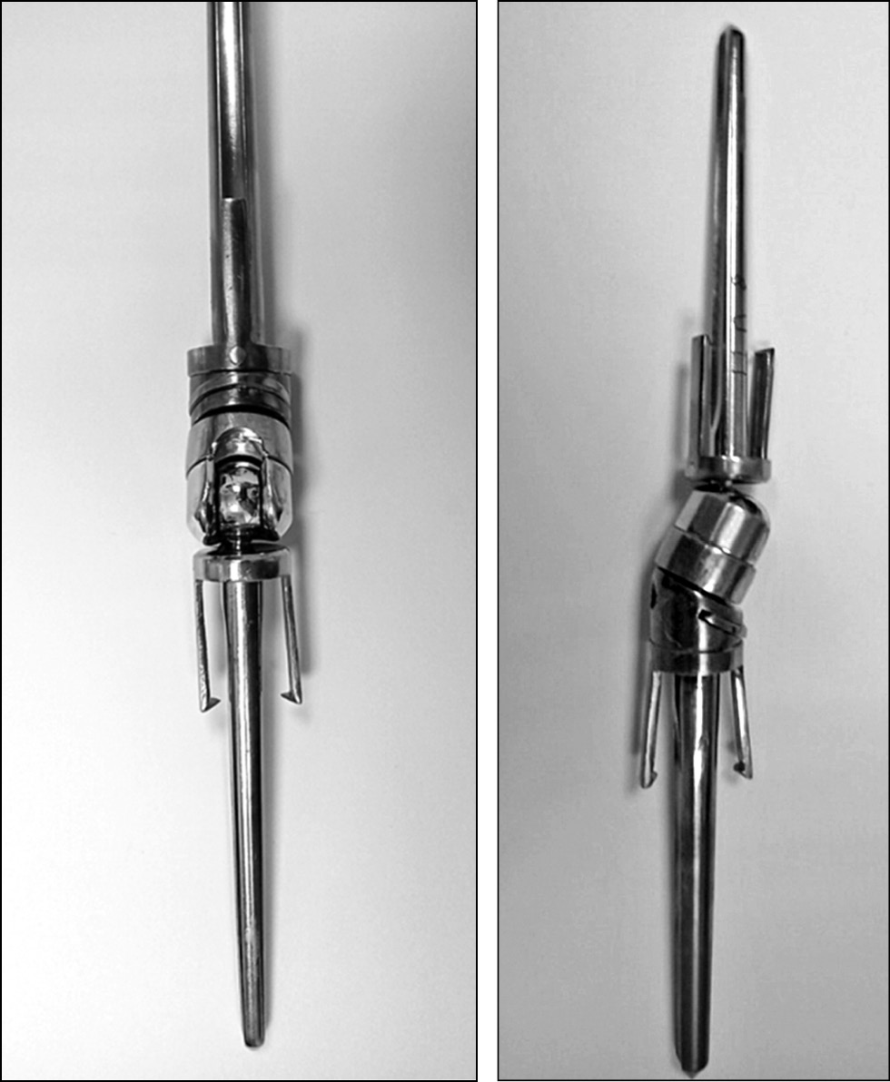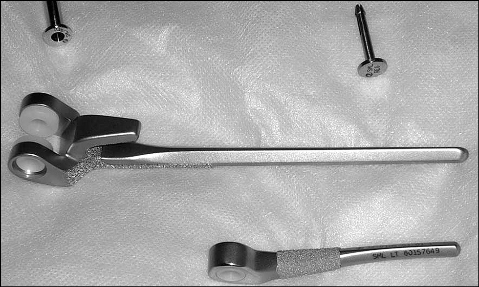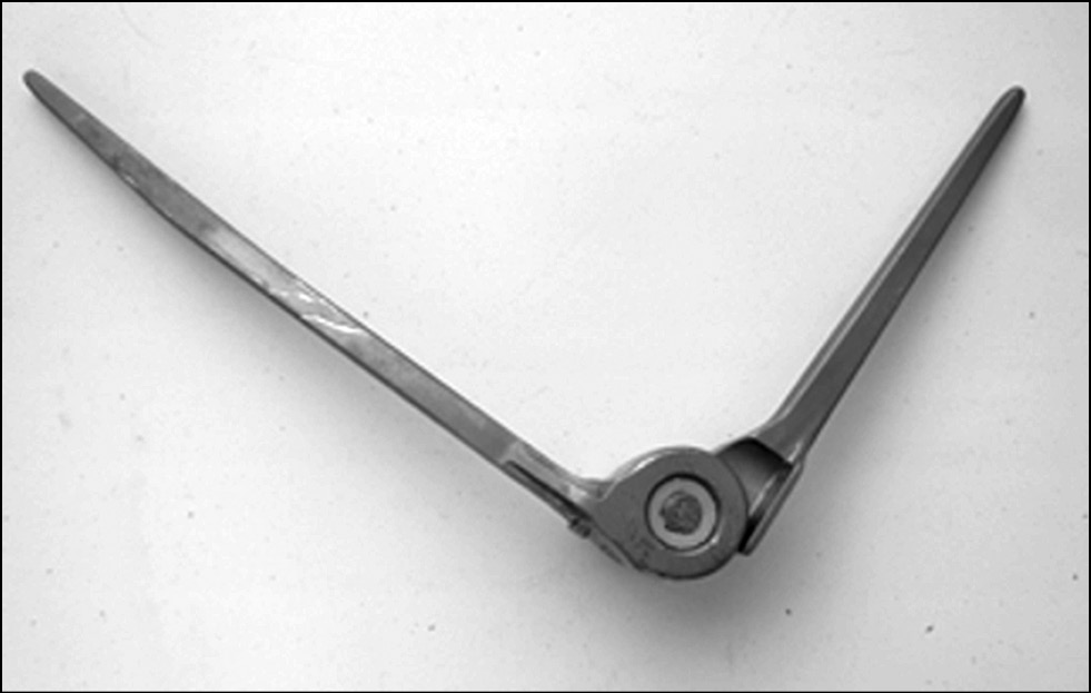 Рис. 3. Усовершенствованная модель эндопротеза локтевого сустава — GSB III. Более поздняя версия отличается наличием опорных фланцев для более плотной посадки на надмыщелки плечевой кости