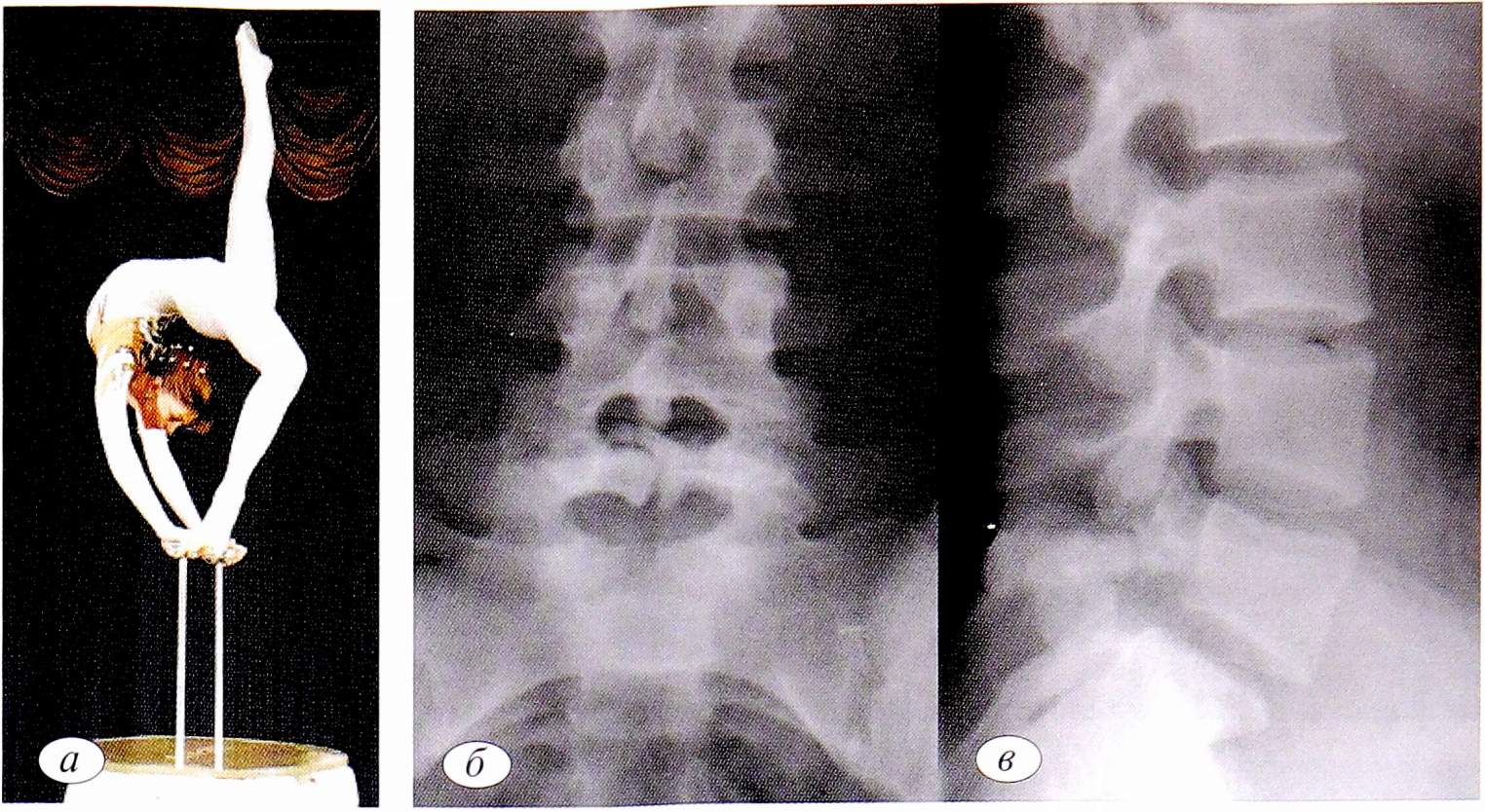 Рис. 1. Пациентка Г.,19 лет, артистка цирка, пластическая акробатка (а). Рентгенограммы поясничного отдела позвоночника: б — прямая проекция — спондилолиз Lv, оссификаты в области дефекта дужки в результате нестабильности; в — боковая проекция — спондилолиз перешейка дуги Lv, нестабильность Lv-SI.
