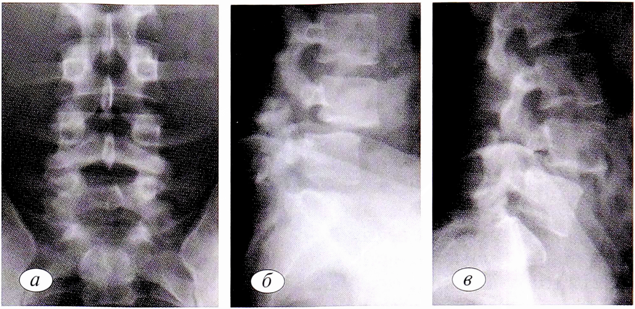 Fig. 3. Radiographs of the lumbar spine of the patient Sh.,24 years (honored master of sports, bandy, Russian national team). a — LV vertebral spondylolysis line; b —projection ¾ — significant defect in LV, vertebral arch area.