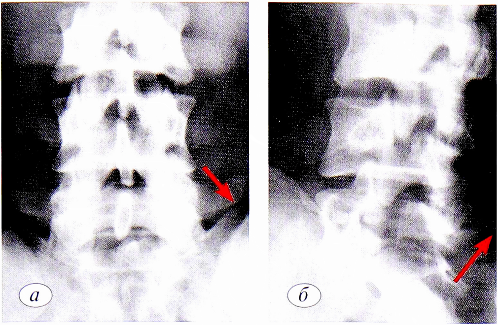 Как отмечалось ранее, прямым признаком спондилолиза является полоса просветления 1-2 мм, проходящая под основанием или через овал контура ножки дуги. Однако на рентгенограмме поясничного отдела позвоночника в прямой проекции линия спондилолиза обнаруживается не у всех пациентов, только в случаях совпадения плоскости дефекта с ходом центрального луча. Более информативны рентгенограммы в боковых проекциях и особенно функциональные пробы, позволяющие выявить не только смещение позвонка и наличие нестабильности, но и спондилолиз.