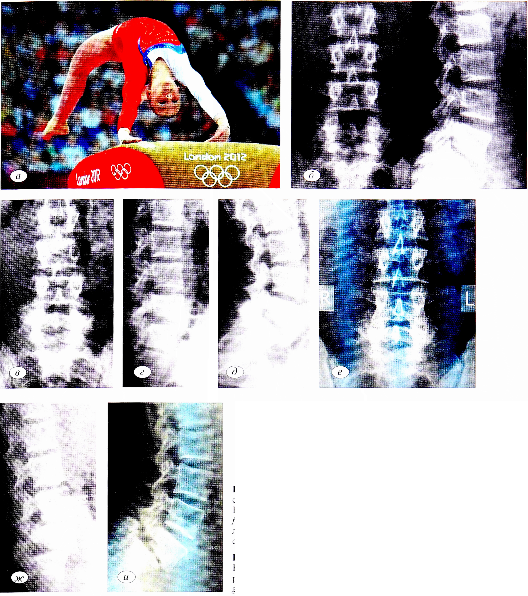 Рис. 4. Больная 77., заслуженный мастер спорта, спортивная гимнастика, сборная России (a). Рентгенограммы поясничного отдела позвоночника: б, в — 2010 г: spina bifida SI, другой костной патологии не обнаружено; г—е — 2011 г.: спондилолиз позвонка Lv, нестабильность Lv—SI; ж—и — 2015 г.: спондилолизный спондилолистез позвонка Lv, прогрессирование нестабильности LV—SI.