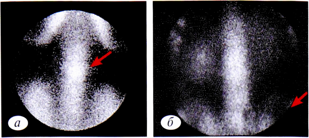 Рис. 5. Сцинтиграммы при спондилолизе. а — гиперфиксация РФП при спондилолизе позвонка LIV; б— гипофиксация РФП при спондилолизе позвонка Lv. РФП — радиофармпрепарат.