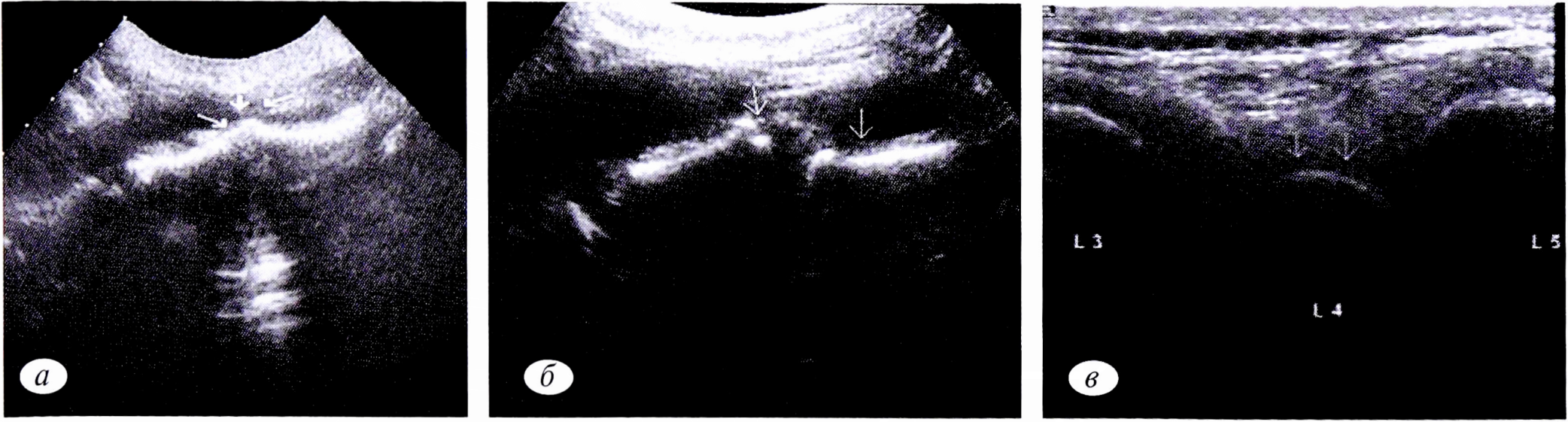 Рис. 6. Эхограммы при различных степенях нестабильности позвоночного сегмента. а — смещение передних границ межпозвонковых дисков; б — ступенеобразное смещение переднего контура тел позвонков; в — смещение задней границы остистого отростка смещенного кпереди позвонка.