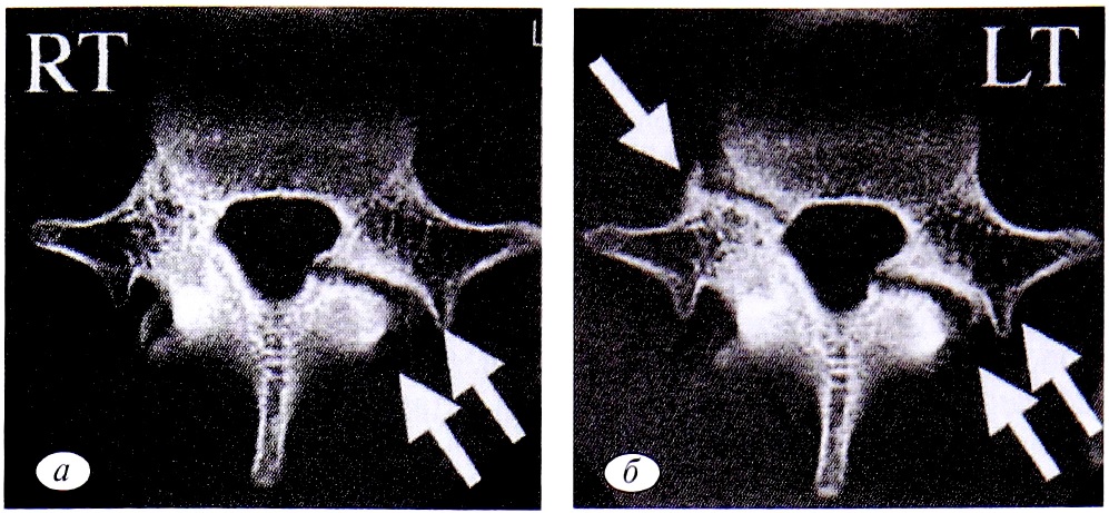 Рис. 7. Данные аксиальной КТ позвонка Lv [25]. а — первоначальное обследование — левосторонний спондилолиз (две стрелки); б — через 2 мес — стрессовый перелом правой ножки дуги (одна стрелка). КТ — компьютерная томография.