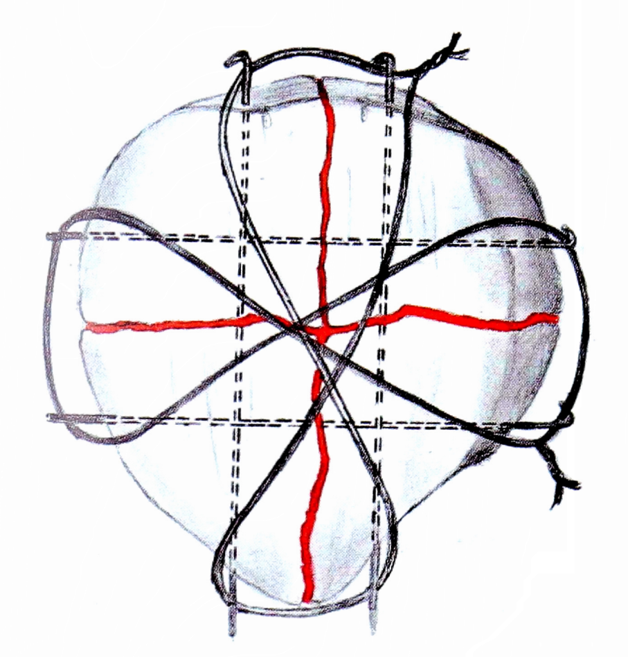 Рис. 2. «Крестообразный» остеосинтез надколенника двумя спицами и двумя проволочными петлями.
