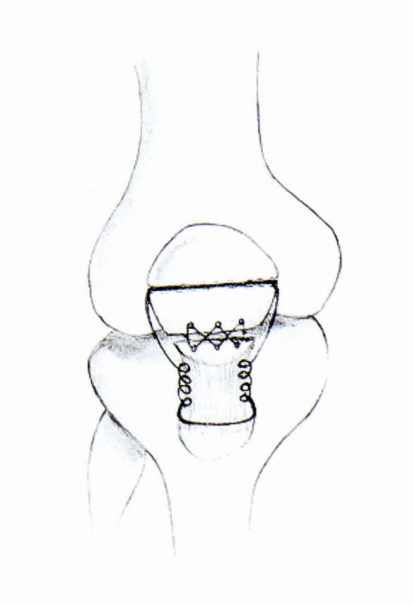 Рис. 3. Чрескостный шов нижнего полюса надколенника с дополнительным частичным армированием собственной связки надколенника.