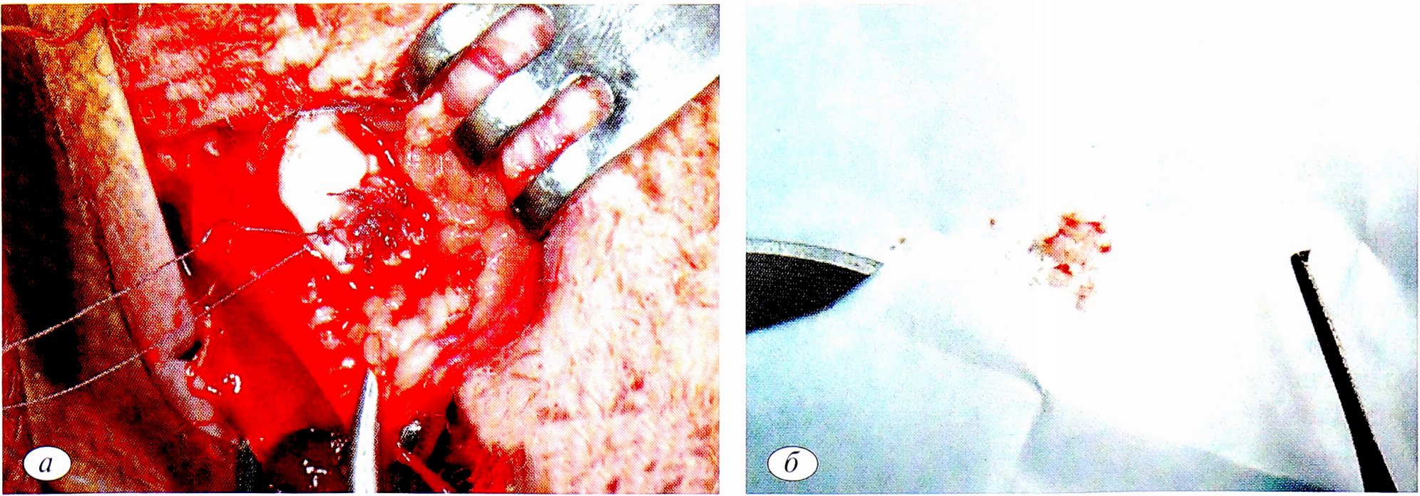 Fig. 2. View of defect after fixation by extracellular collagen matrix (VCM). a — VCM; b — crushed autochthonous.