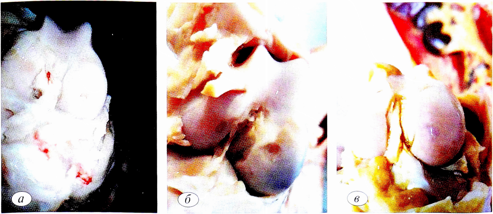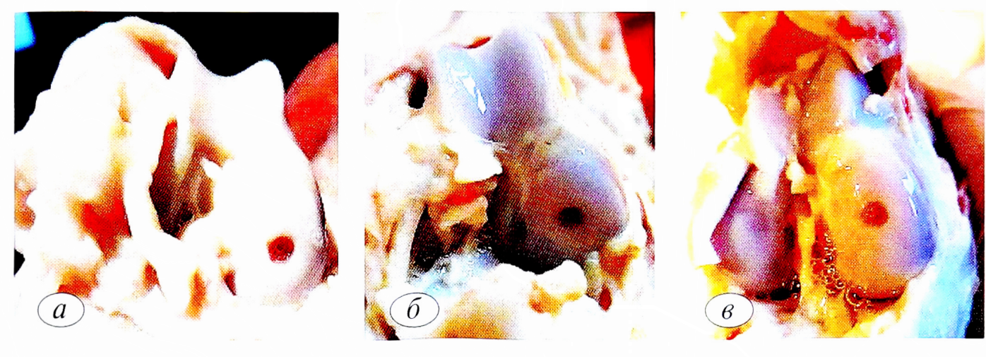 Рис. 7. Динамика макроскопической картины в третьей экспериментальной группе. Внешний вид дефекта: а — через 1 мес; б— через 3 мес; в — через 6 мес.