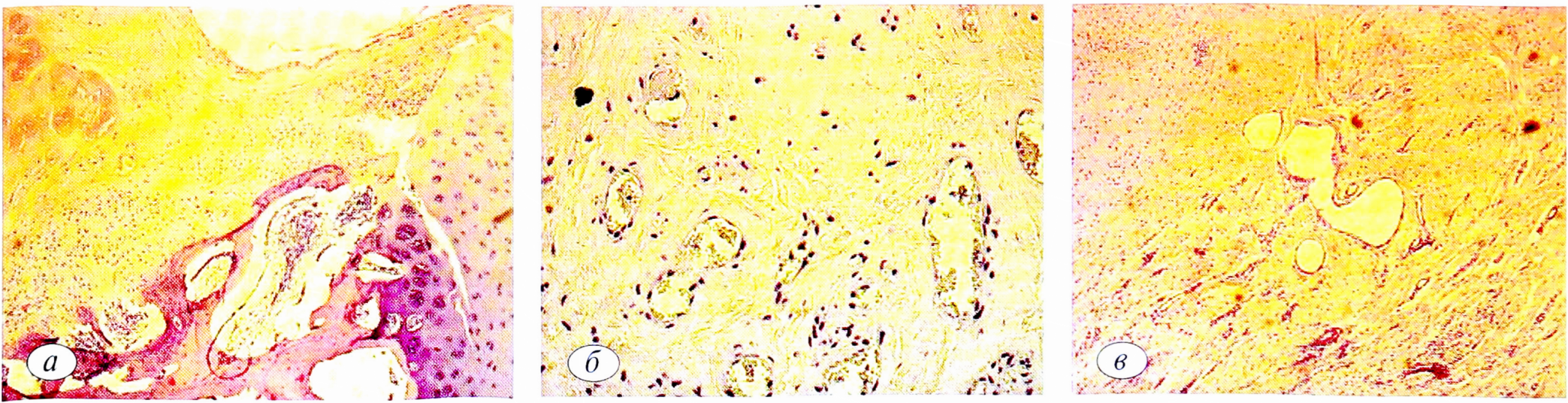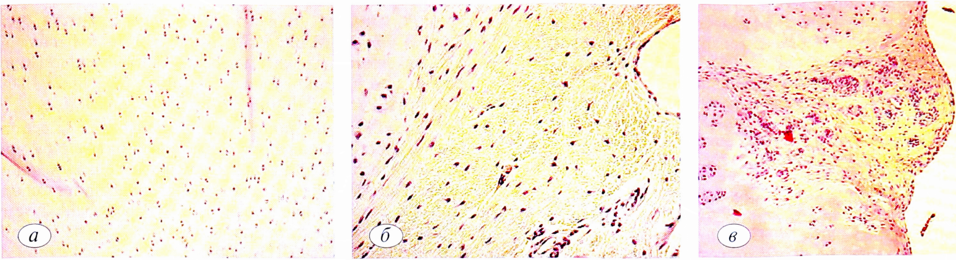 Рис. 8. Микроскопическая картина дефекта в динамике, где: а — 1 мес; б — 3 мес; в — 6 мес. Увеличение ×40.