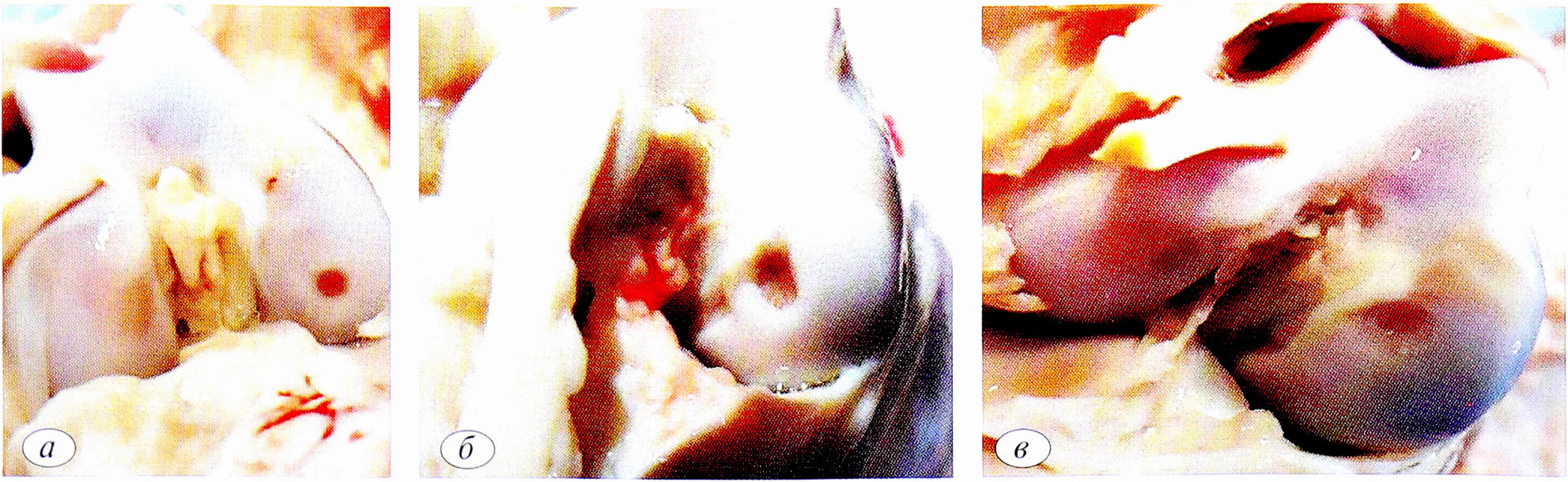 В 1-й группе к 6 мес наблюдения макроскопически определяли динамику восполнения дефекта в рамках минус-ткань: дно костно-хрящевого дефекта эрозировано, практически не заполнено рубцовой или хрящеподобной тканью, граница между зоной дефекта и здоровым собственным гиалиновым хрящом прослеживается четко (рис. 3, а). Глубина дефекта итогово составляла в среднем 3—6 мм.