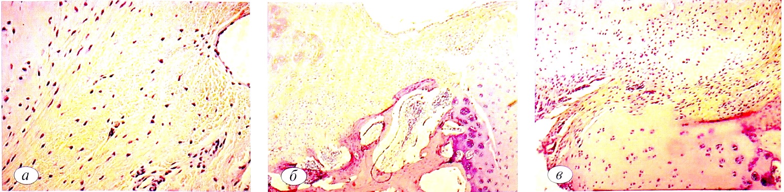 Микроскопически область костно-хрящевого дефекта по краям выполнена гиалиновоподобной хрящевой тканью, которая местами разделялась на слои (поверхностный, промежуточный, глубокий). Субхондральная костная пластинка восстановлена на всем протяжении; волокна ее утолщены, оформлены. В большинстве своем элементы костной ткани ориентированы пространственно перпендикулярно кортикальной пластинки, основное вещество в умеренном количестве, гомогенное (рис. 5, б).