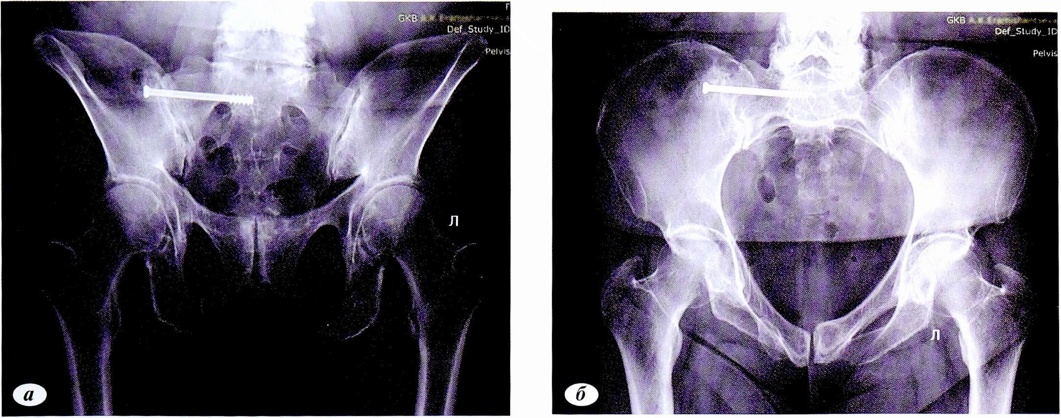 Fig. 2. Radiography of a consolidated fracture of the lateral sacrum mass on the right, one year after surgery. Osteosynthesis by cannulated screw. Consolidated fracture of the ischium on the right, a — outlet view; 6 — inlet view.