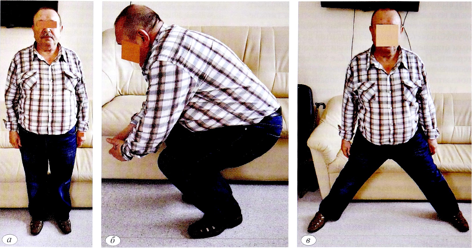 Рис. 5. Пациент Л. 70 лет. а—в — внешний вид и функция через 12 мес после травмы.